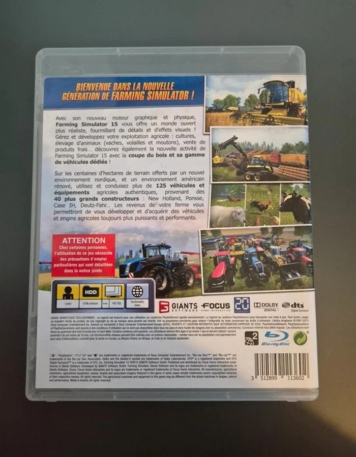 Farming Simulator 15 Playstation 3 Jeu en très bon état Vendu comme sur les photos. Envoi sous 24h sauf les dimanches et jours fériés si achat réalisé avant 20h. (Mondial Relay, Bpost, UPS) Pour les envois Homerr, envoi sous 48h du lundi au vendredi.