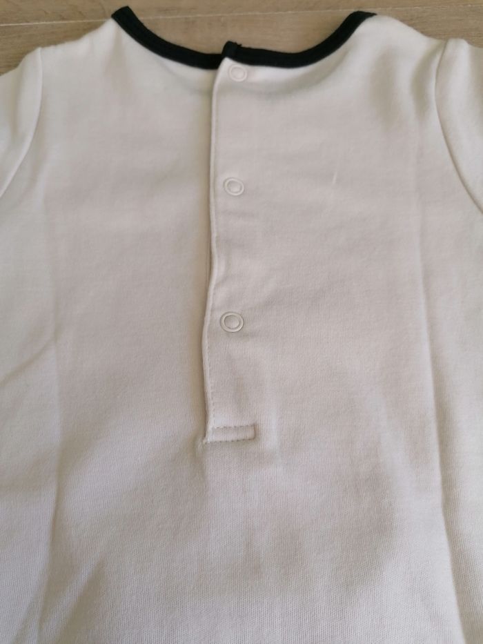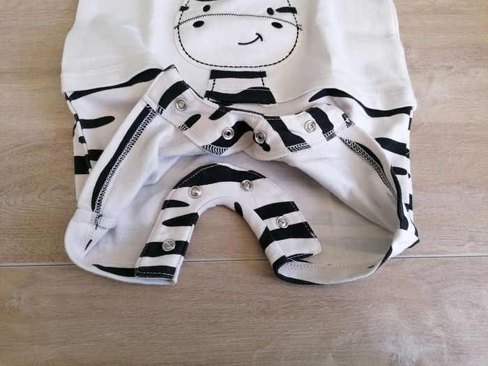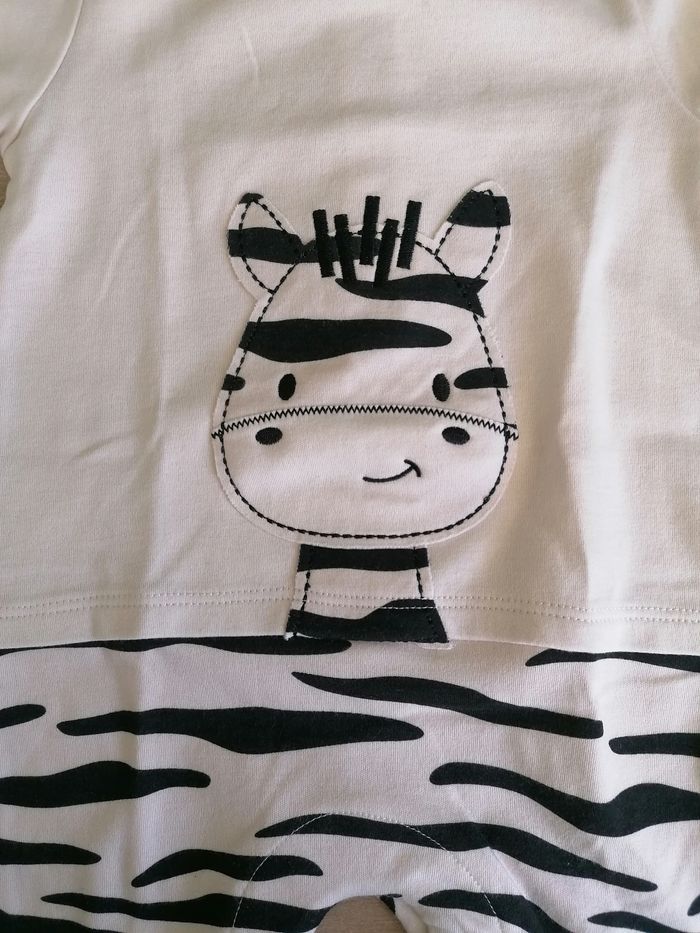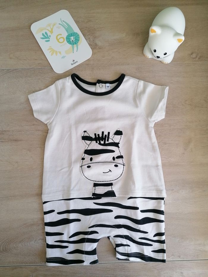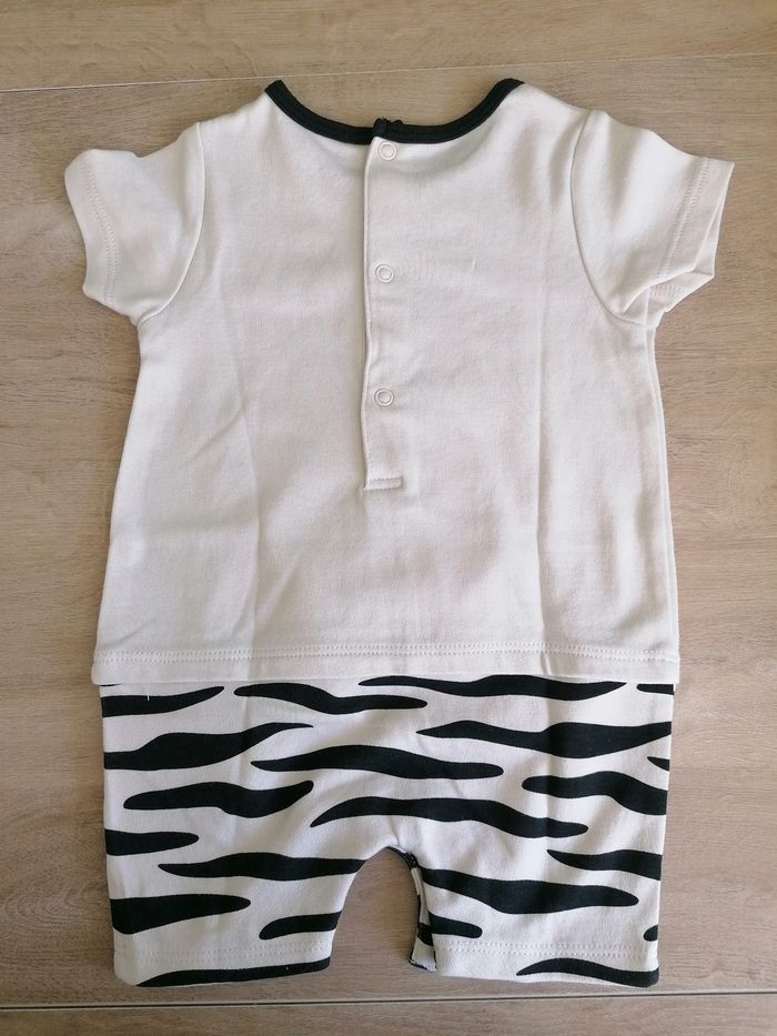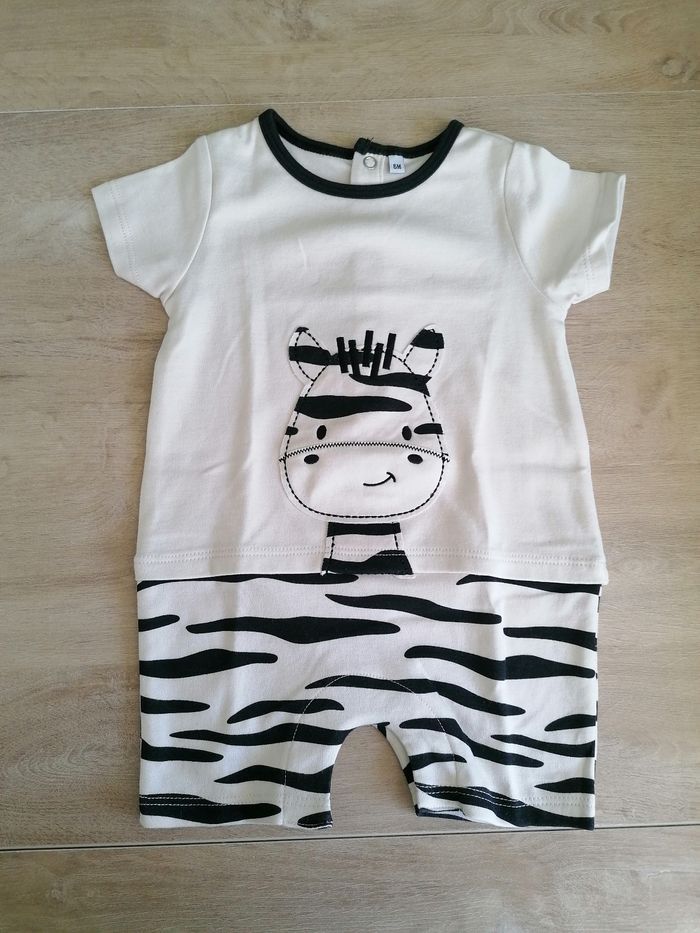 Barboteuse à manches courtes. Carrefour, 6 mois. Beige avec tête de zèbre sur le ventre et bas motif zébré beige et noir. Boutons pressions à l'entrejambe et 3 boutons pressions dans le dos. 60 % coton, 40 % polyester. Jamais porté, juste lavé une fois.