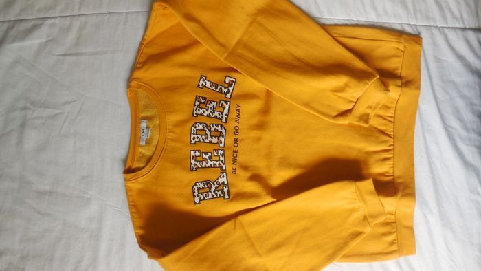 Lot de 2 sweets le noir (marque la redoute) est en 14 ans et le jaune (marque La Halle) en 16 ans (voir les étiquettes), le noir est un peu plus serré (cintré). Le noir a été un peu plus porté, le jaune est quasi neuf.