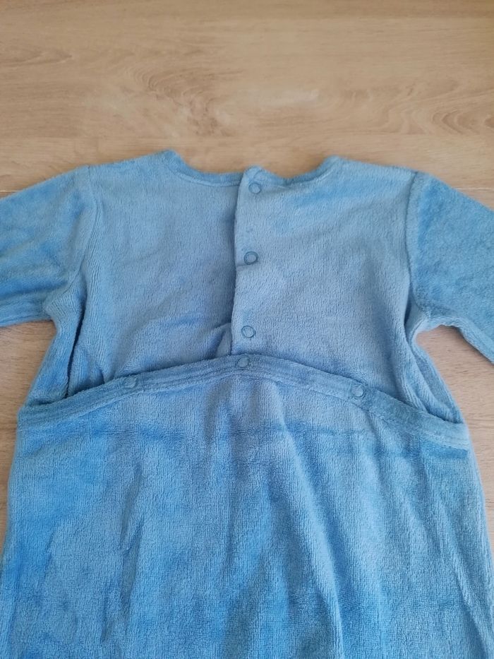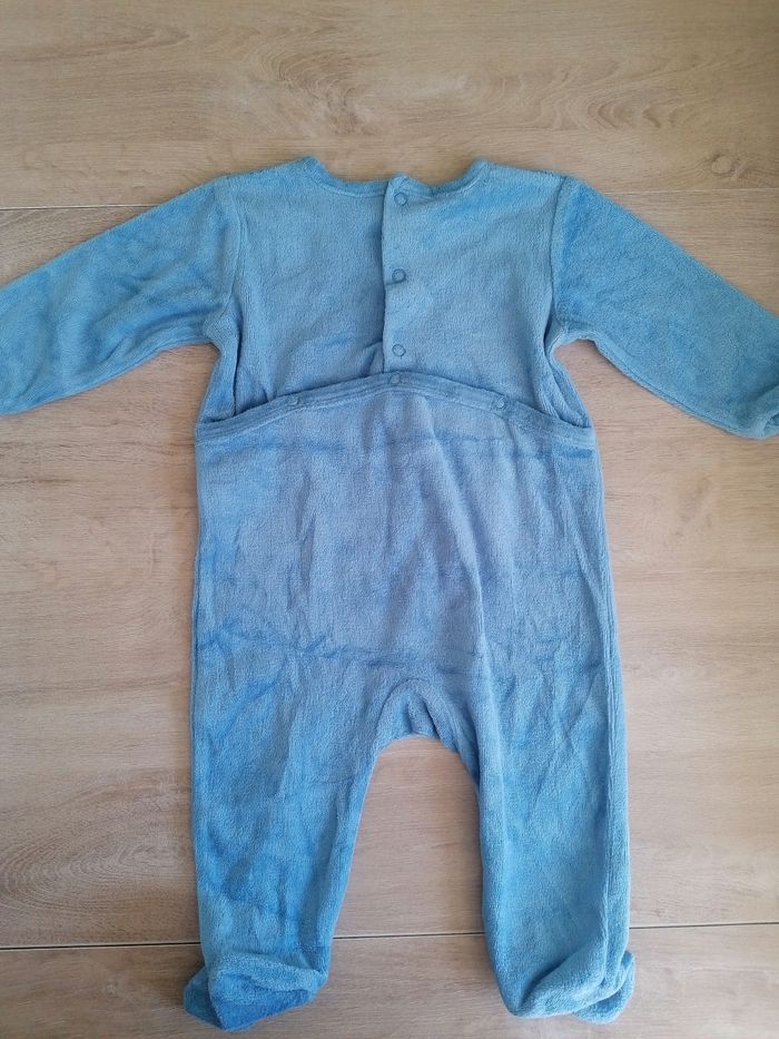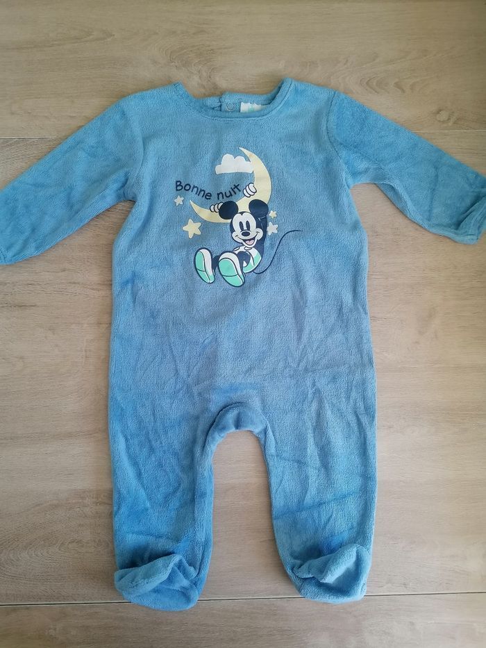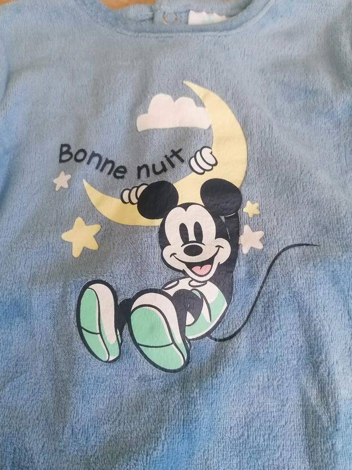 Pyjama Mickey. Disney Baby, 6 mois. Bleu avec dessin de Mickey floqué sur la poitrine. Fermeture à l'arrière par boutons pressions. 75 % coton, 25 % polyester. En très bon état.
