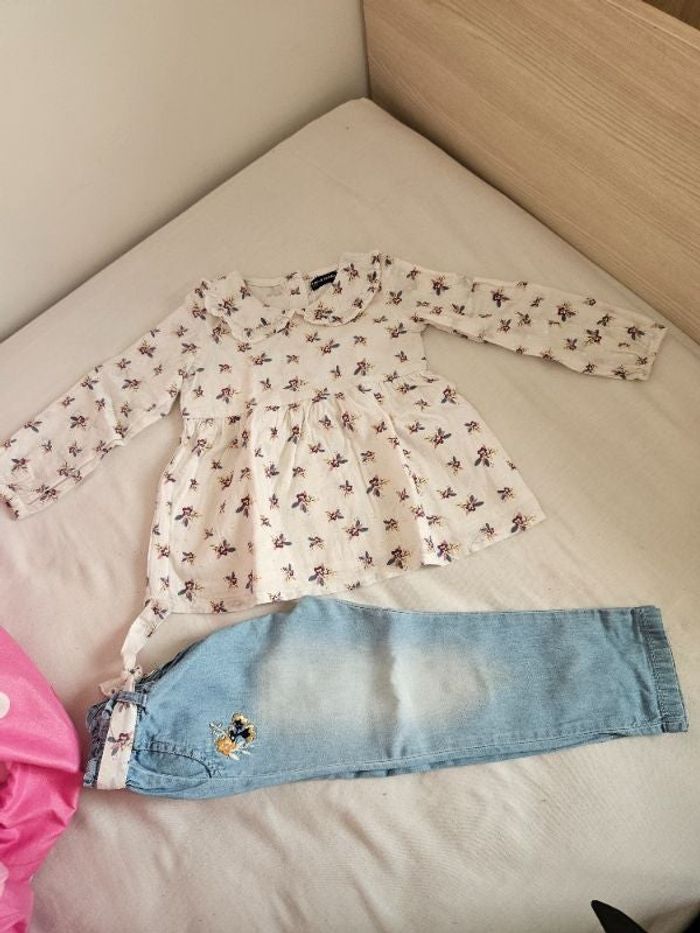 Ensemble bébé fille pour le printemps, pantalon et blouse assorti. Le pantalon est légèrement tâché sur une jambe mais la tunique est impeccable. Pantalon léger simili jean, avec ceinture cousi au pantalon. Taille 18 mois Blouse avec tissu doublé, taille 24 mois