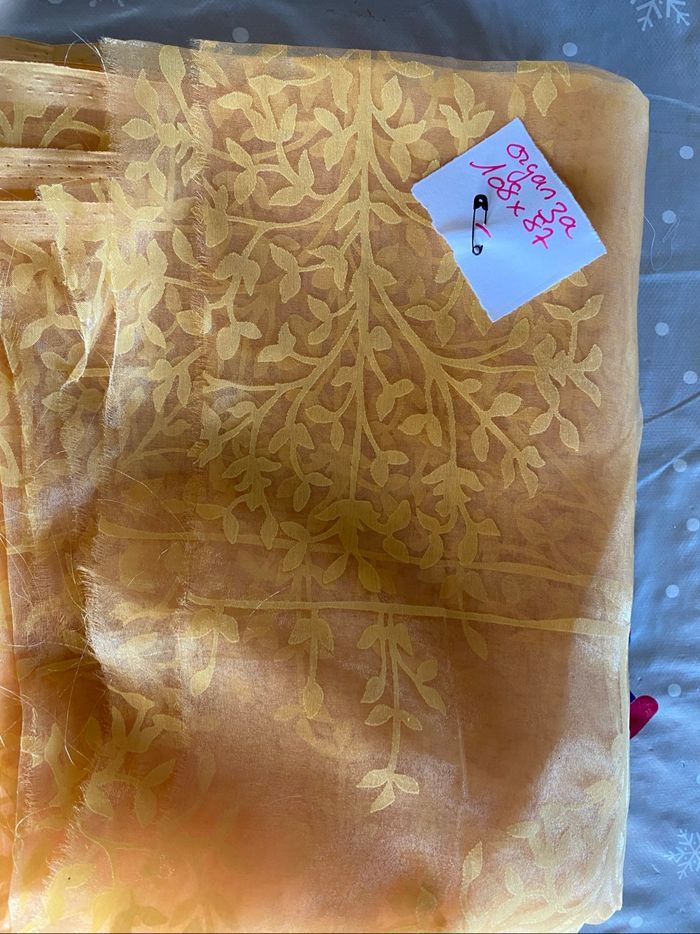Coupon de tissu, organza, jaune avec motifs végétaux. Dimension 1,08 m/ 0,87 m. Reduction lots