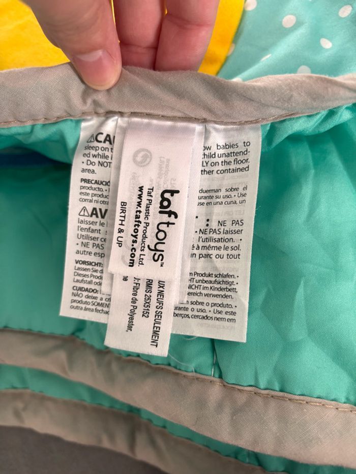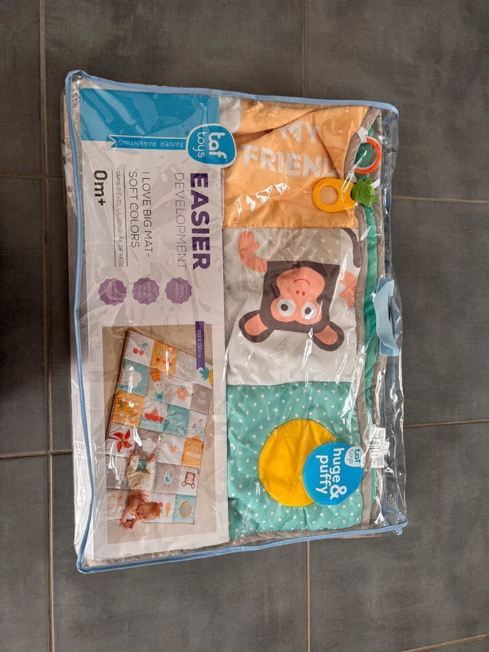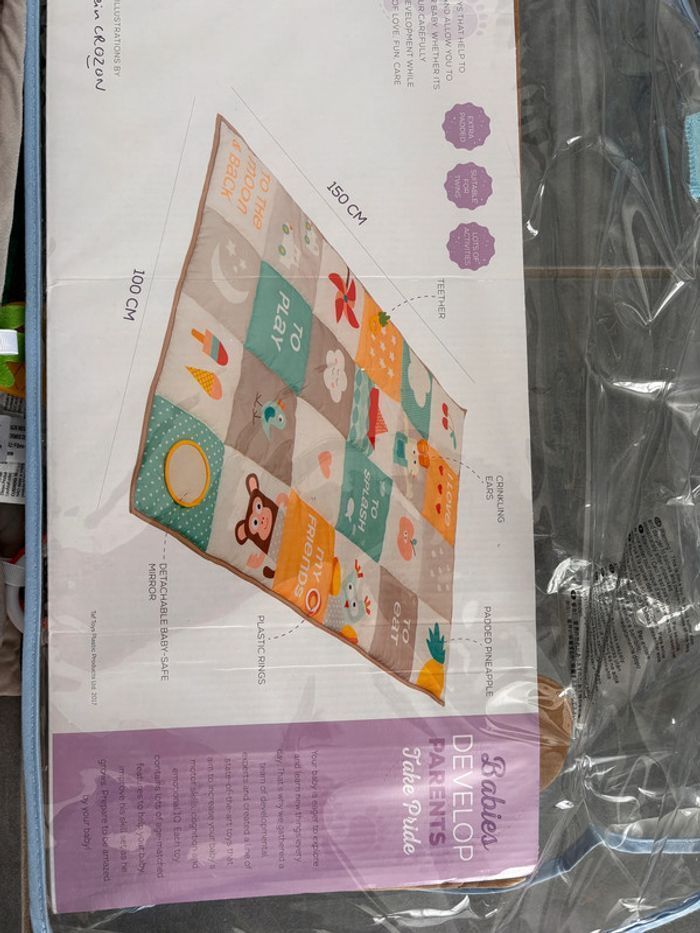 Grand Tapis d’eveil Marque taf toys Plusieurs anneaux de dentition, bruissement et forme. A partir de la naissance (0+) Taille: 150cm x 100cm Lavable en machine Transportable Avec son sac Manque juste le miroir détachable Acheté 55€