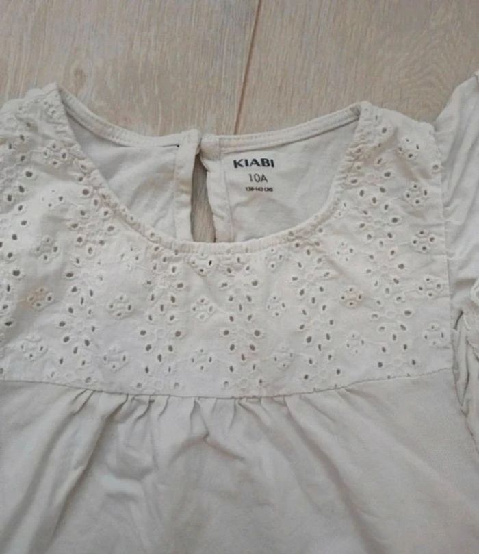 Ensemble Kiabi taille 10 ans. Composé d'un tee shirt blanc à col rond avec broderies anglaises et d'une jupe en popeline avec taille smockée. Le tee shirt est légèrement taché sur l'avant mais peu visible une fois porté. #ccj1367fille10ans #kiabifille10ans #kiabiétéfille