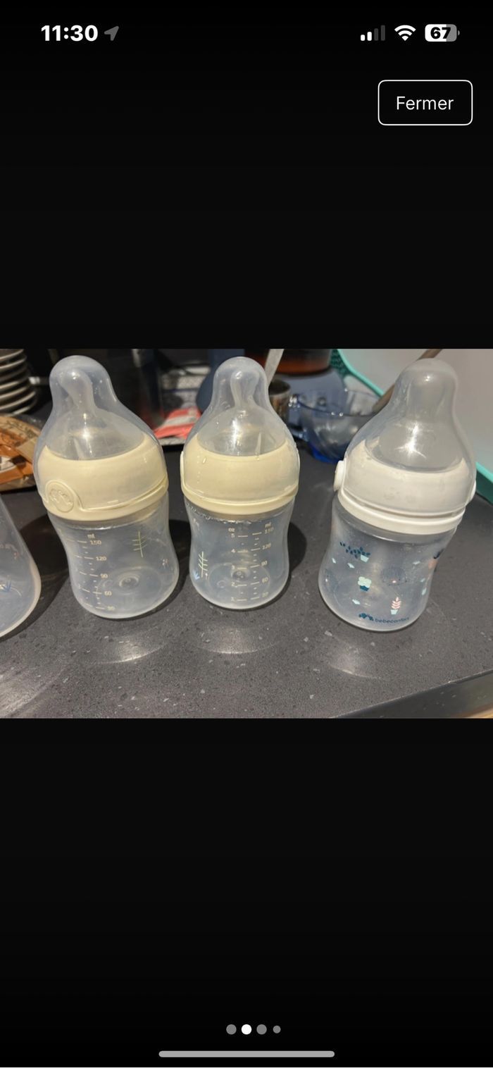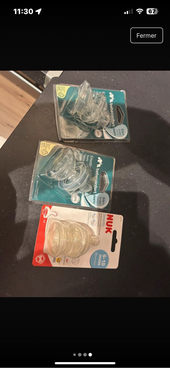 Plusieurs tétines neuve Les grand Biberon sont neuf avec tétine neuve dessus Les petit sont utiliser 1 semaines mon fils n’aime pas (sans tétine )