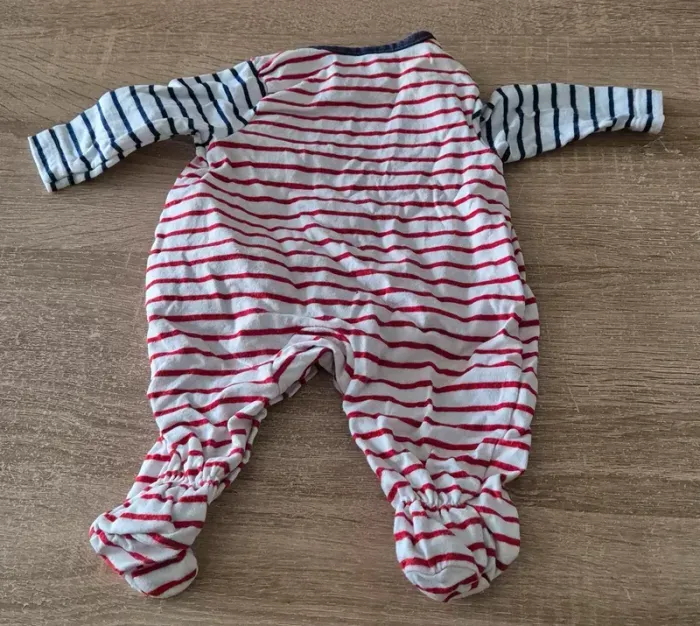 Pyjama de couleur blanche avec des rayures rouges et bleues. Il s'ouvre sur le devant. Taille 1 m/54 cm