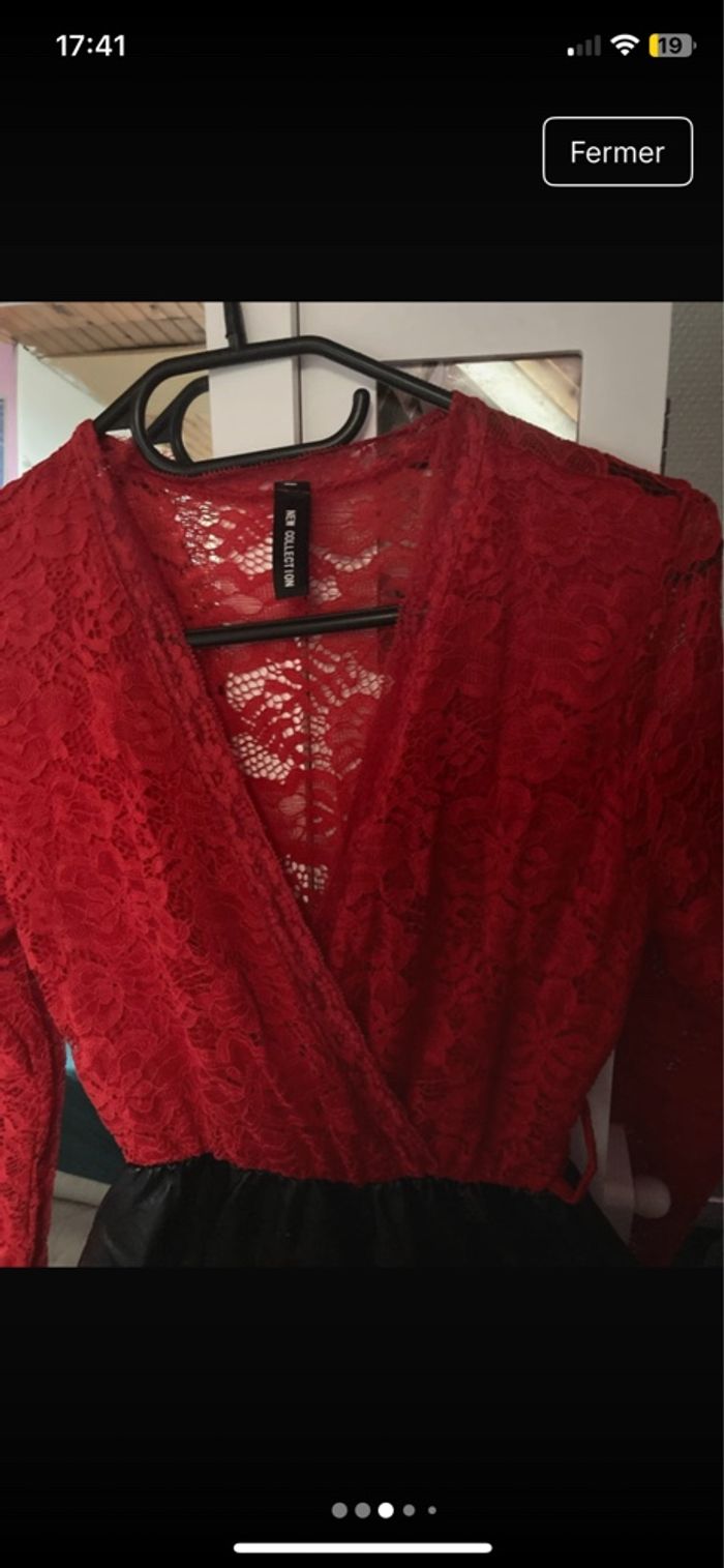 Robe en très bon état le haut est rouge en dentelle et le bas est noir en cuir taille unique
