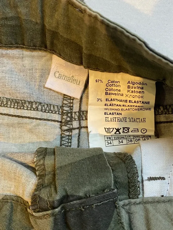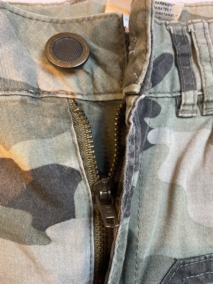 En très bon état. Mini jupe imprimée militaire avec poches avant et arrière , zip et bouton. Mélange coton majoritairement et elasthanne pour effet stretch Longueur taille bas 35 cm Marque Camaïeu Taille 34 mais convient aussi à un 36 #maemayllisjupes