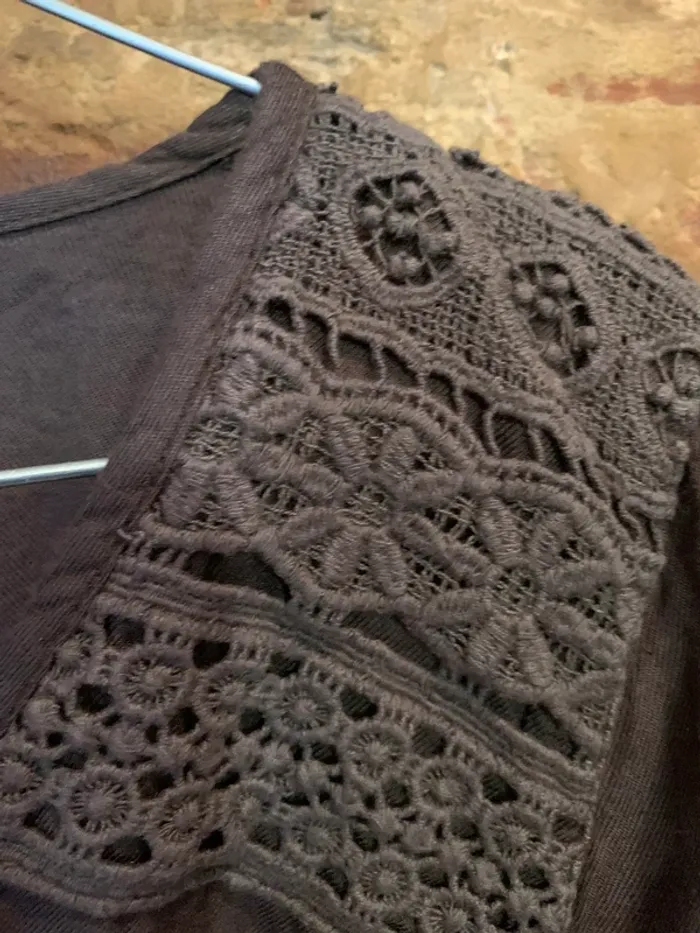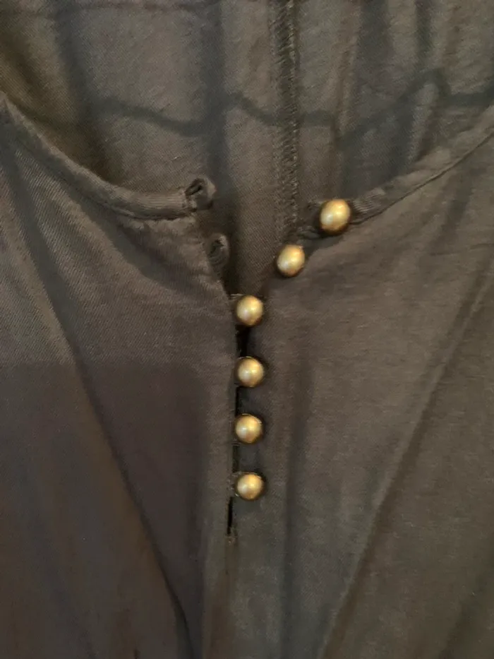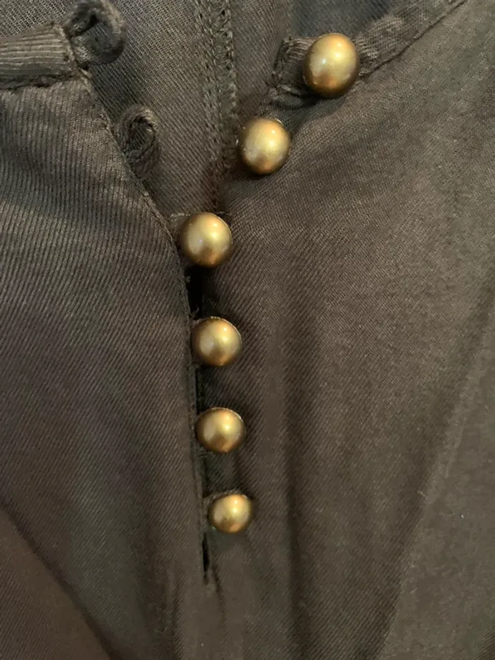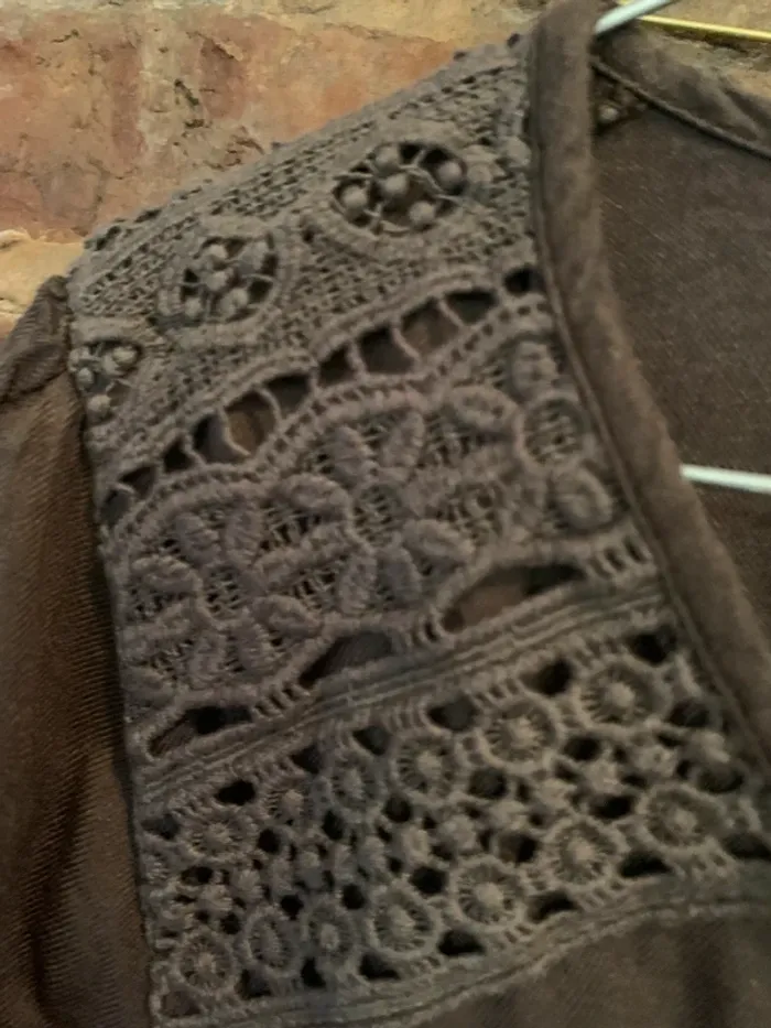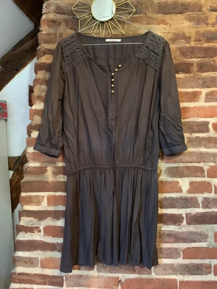 Très peu porté en parfait état Robe kaki boutons bronze et détails brodés aux épaules manches 3/4 avec boutons 100% viscose Marque Camaieu Taille 38 assez ample et fluide Parfaite pour la demie saison #maemayllisrobes