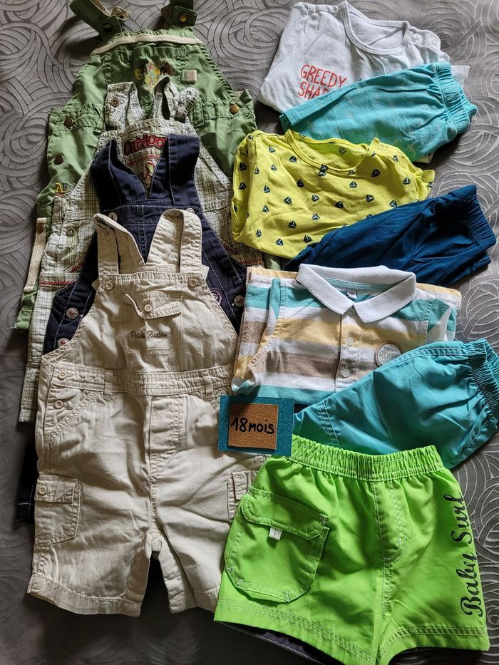 En très bon état Lot comprenant 4 salopettes courtes 1 short de bain 3 ensembles short et tee-shirt MC Taille 18 mois pour le lot #jademilogarcon18mois