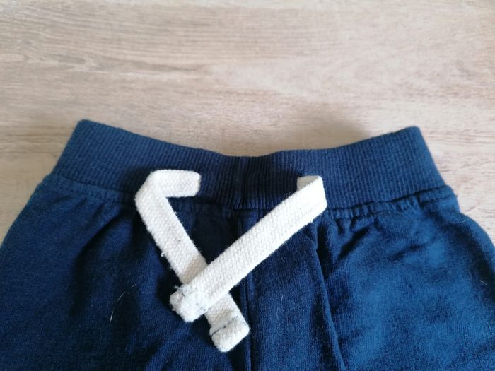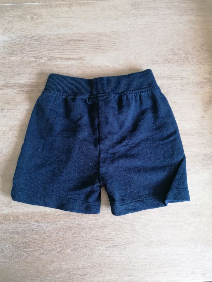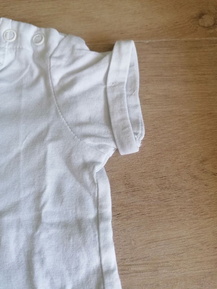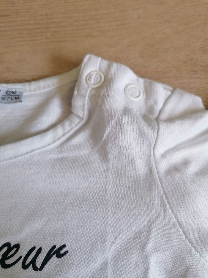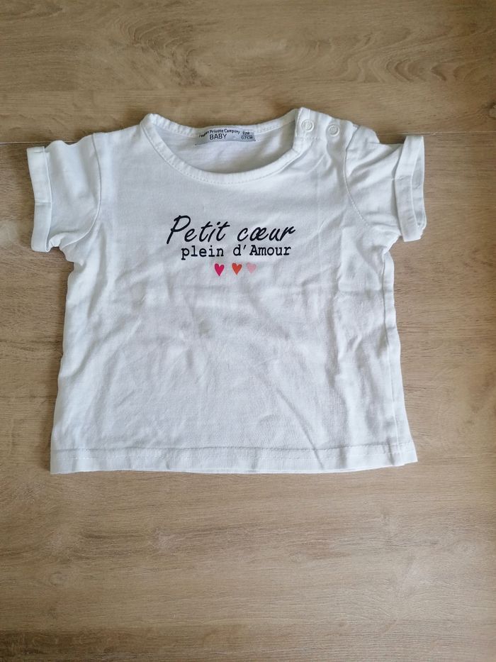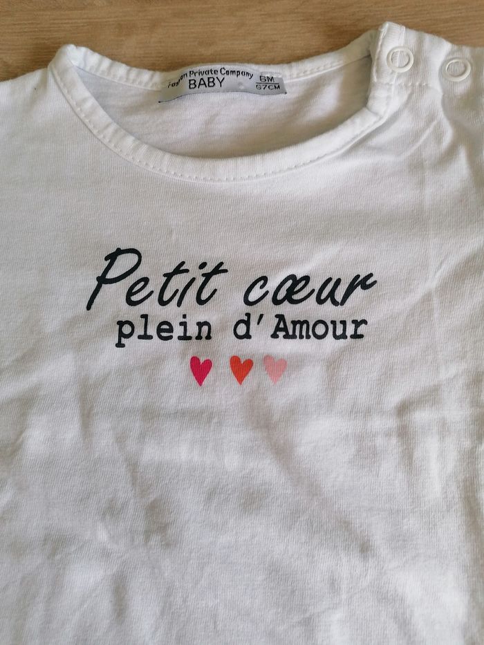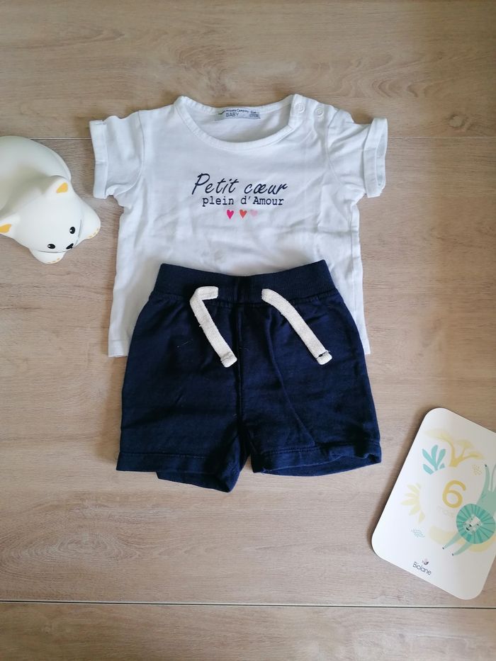 Ensemble composé d'un t-shirt à manches courtes et d'un short. T-shirt à manches courtes. Fashion Private Company Baby, 6 mois (67 cm). Blanc avec inscription noire et petits cœurs sur la poitrine. 2 pressions sur le côté du cou. Revers cousu aux manches. 100 % coton. Short bleu marine. Sans marque, 68 cm. Élastique à la taille avec cordon. 100 % coton bio. Les 2 articles sont neufs et ont juste été laves une fois.