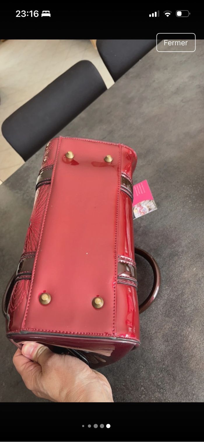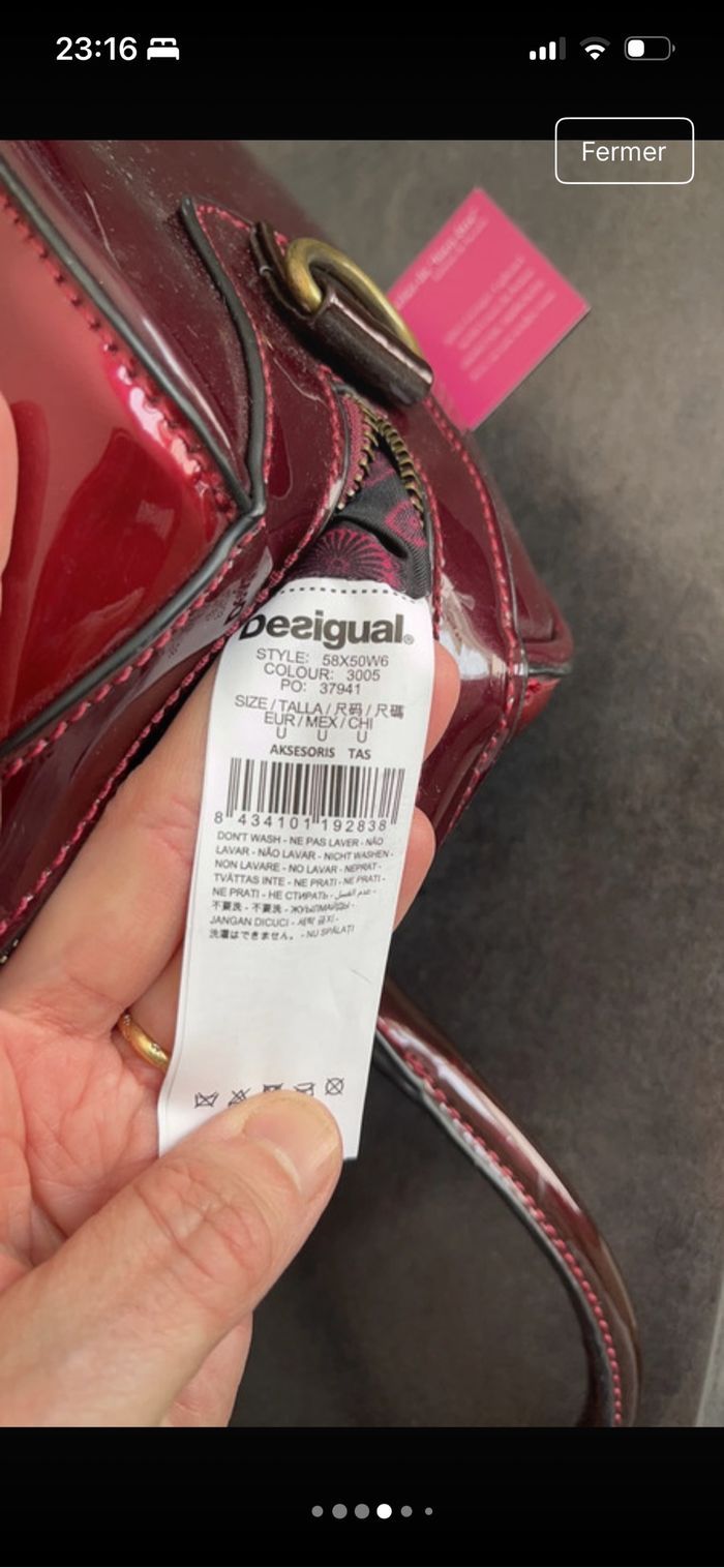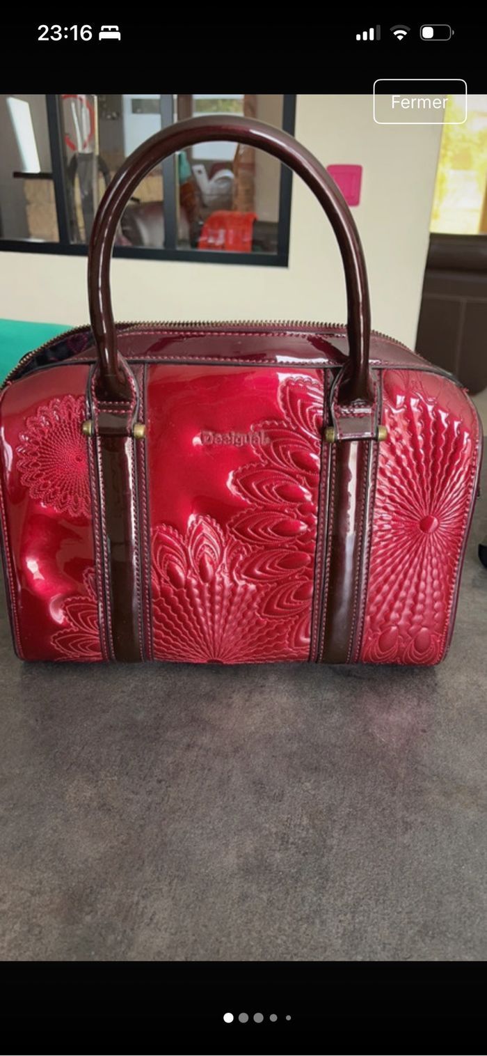 Sac Desigual, série limitée, couleur bordeaux, brillante avec motifs Longueur 30 Largeur 15 Hauteur 22
