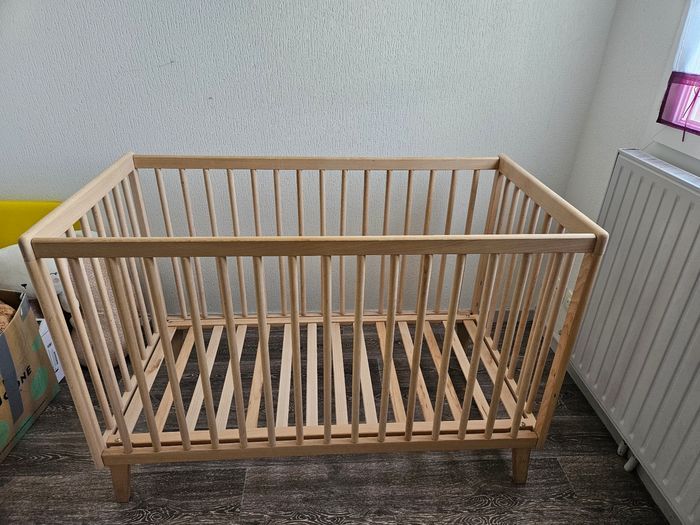 Lit bébé Turia 60x120 cm Hêtre massif Finition cire naturelle Certifié PEFC Fabriqué en Espagne Sommier réglable 3 positions Très bon état car n'a que très peu servi Pas d'envoi pour cet article