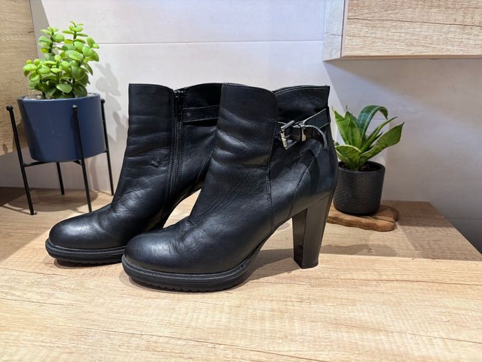 Bottines en cuir. Taille 40. Très confortable. Talon 10cm. Un léger défaut peu visible. Sur photo 2 Peu porté. Vendu avec boîte d'origine