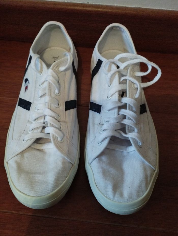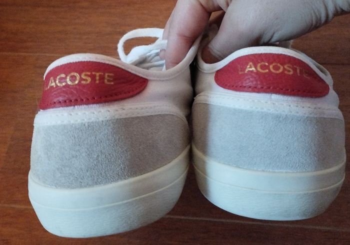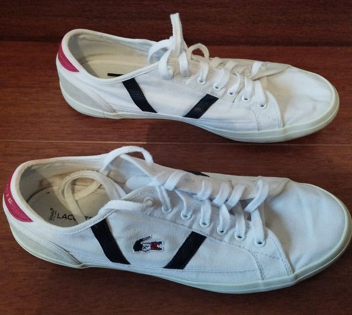 Baskets blanches de la marque Lacoste. C'est du 43. Elles sont en tissu avec des détails bleu et rouge. Elles ont beaucoup de tâches et les couleurs bleu et rouge ont délavées sur le tissu à certains endroits.