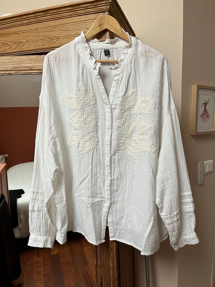 Tunique comme neuve mais sans étiquettes. Article blanc en gaz de coton. Ses broderies très jolie sur le devant qui sont bien blanches, les photos rendent un effet different. Des manches légèrement bouffantes (photo 3). Resserrées aux poignets avec un petit bouton. Son petit col froncé très mignon et tendance. Taille : 3XL = 52/54 en chiffres.