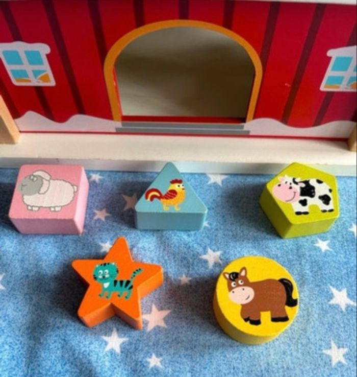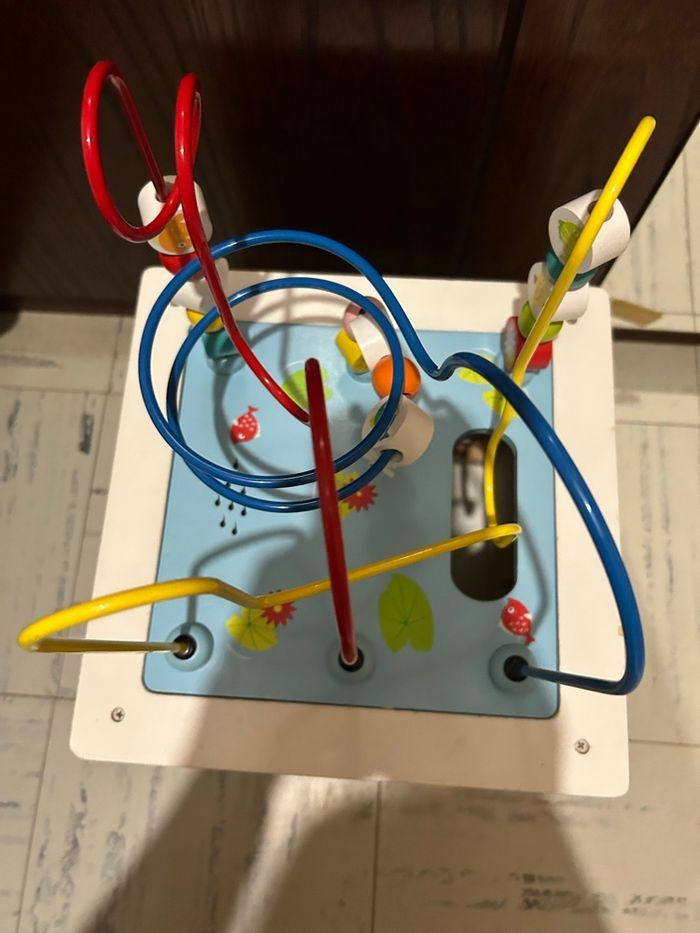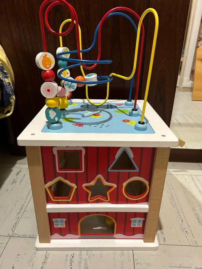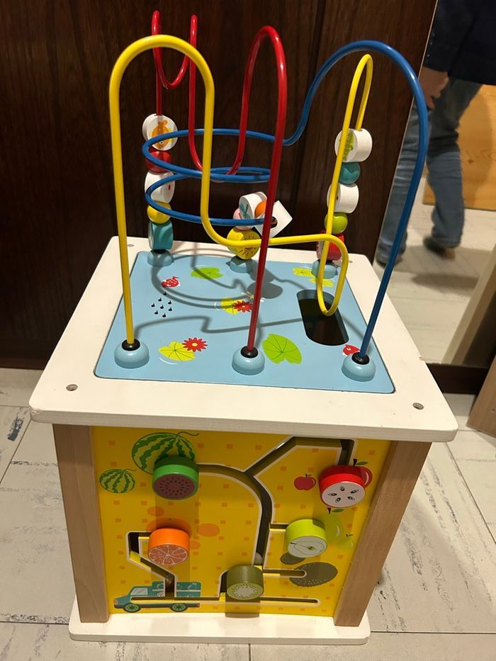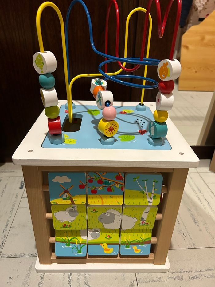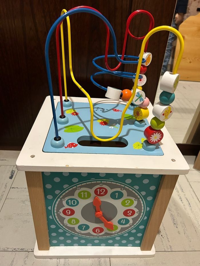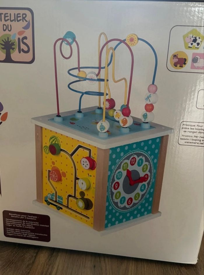 Un cube en bois et métal avec plusieurs activités dont des loopings avec des perles, un jeu de correspondance des formes (boîte à forme) sur le thème de la ferme avec 5 formes, 1 labyrinthe sur le thème des fruits, 1 horloge et un puzzle 2 en 1 de 9 pièces à retourner pour découvrir des moutons ou un cheval. Pratique : pour un gain de place les loopings peuvent se ranger dans le cube. CE jeu léger et facile à manipuler permet de développement de la motricité et de la coordination main/œil et l'apprentissage des objets. Caractéristiques Cube Multi-activites Âge requis : dès 12 mois Dimensions de l’article : L28 x l28 x h51 . Légères traces d’usures sur les pièces et un éclat sur le dessus