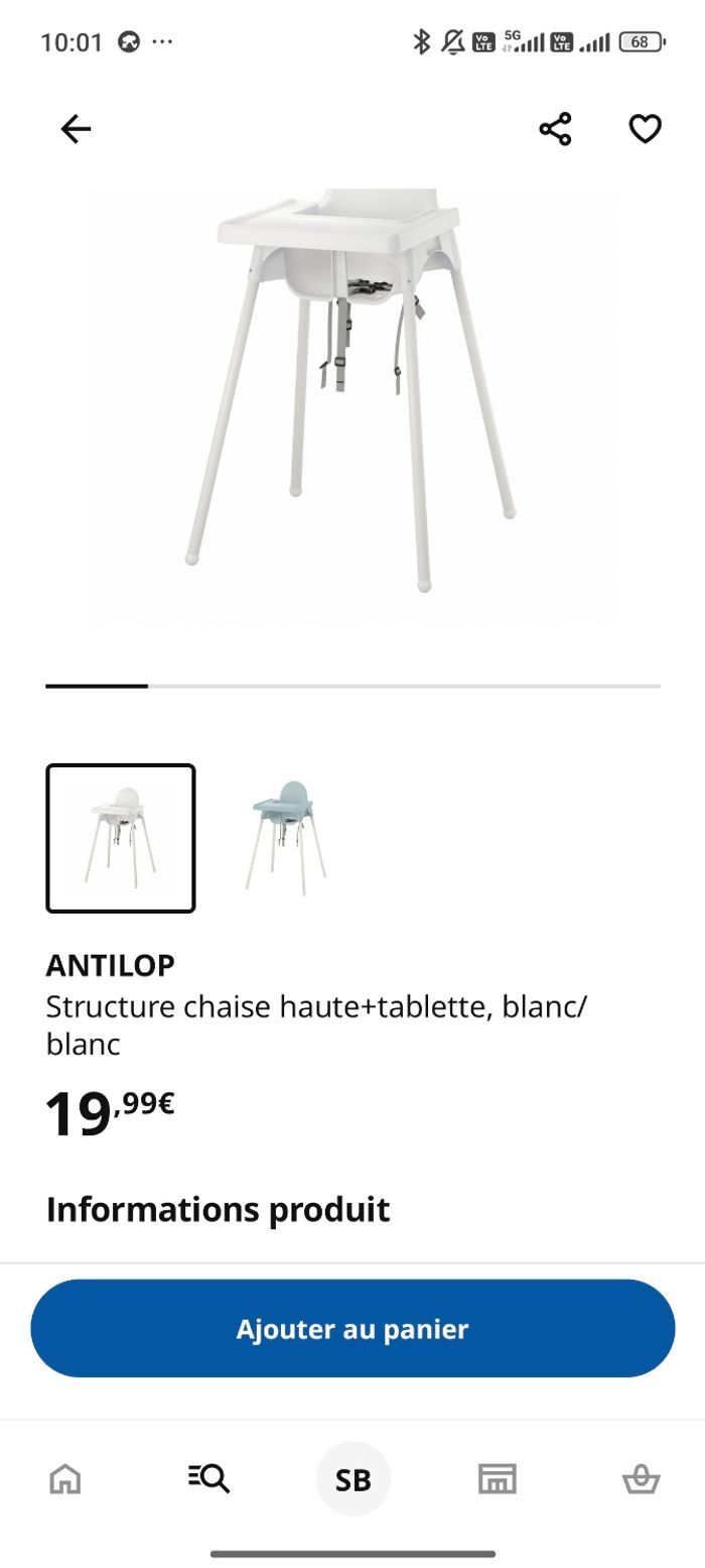 Chaise haute "Ikea" Valeur neuf 20€ Parfait état. Vendu 10€ avec coussin inclus