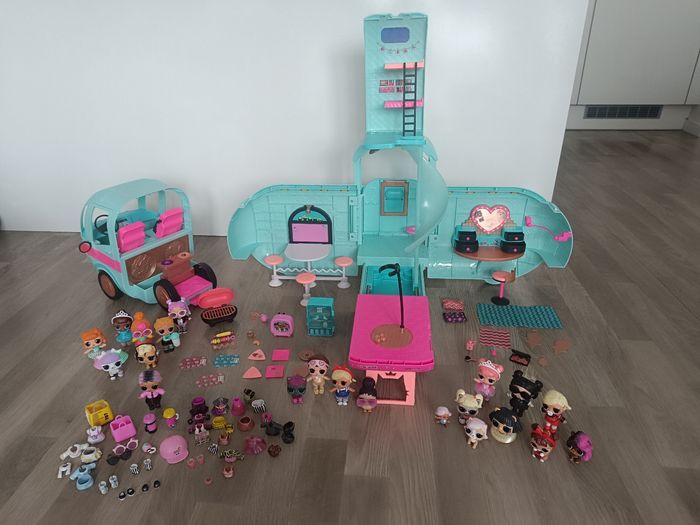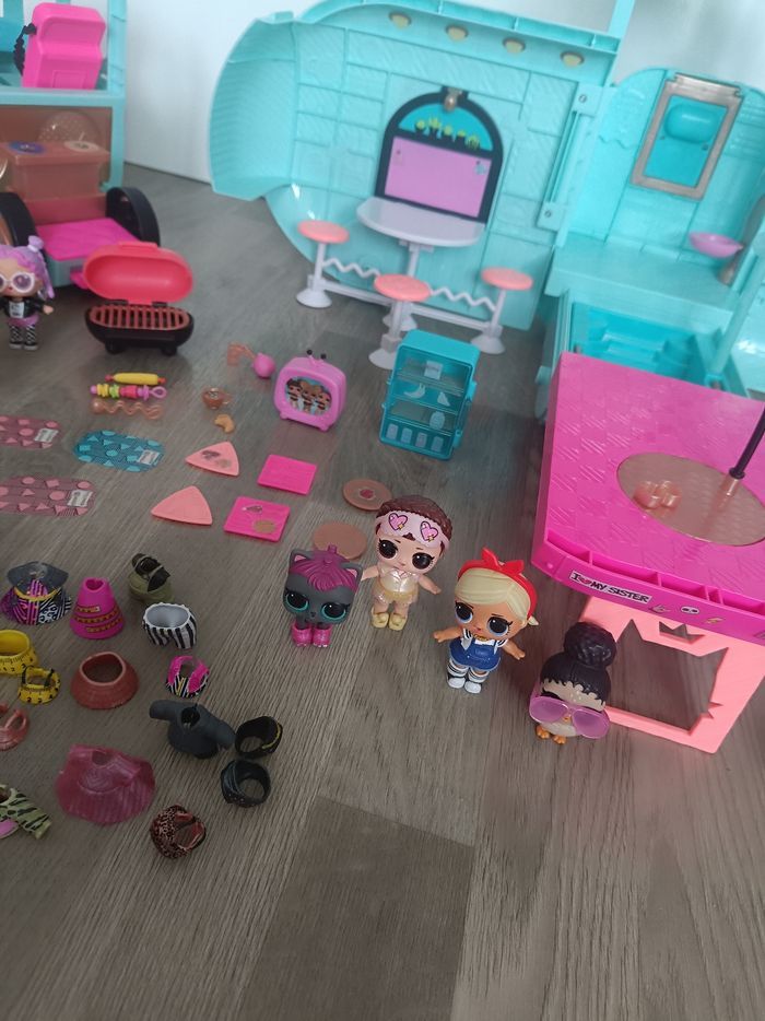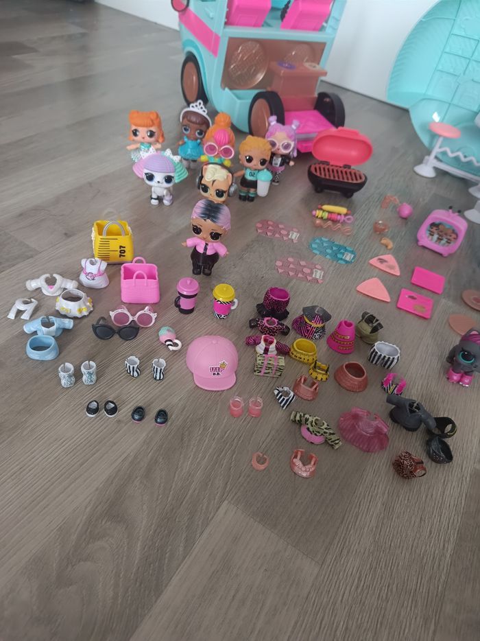 Camping car poupée lol en excellent état et complet avec ses accessoires. Avec 11 petites poupées lol et un bébé 8 animaux, vêtements chaussures et accessoires