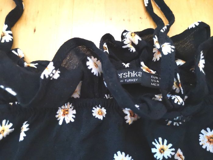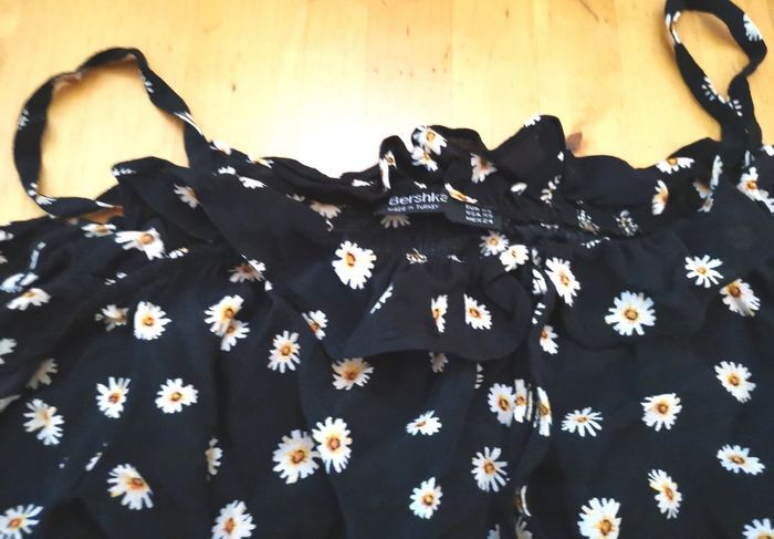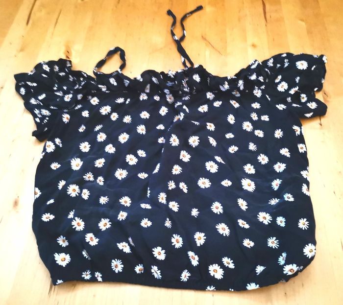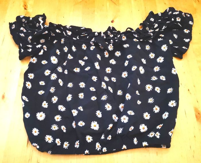 Petit top crop "Bsk", en tissu couleur bleu à marguerites, fines bretelles et manches très courtes, taille XS, quasiment neuf,
