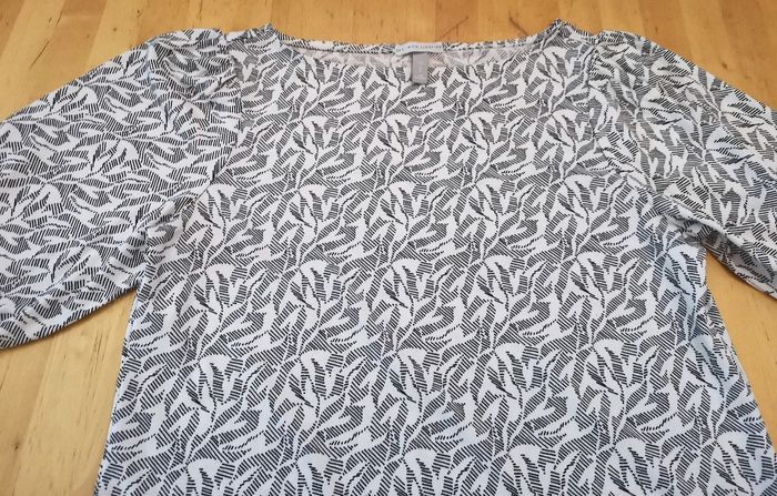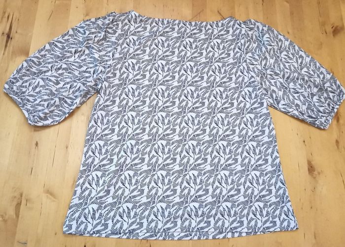 Blouse "Memory", en tissu fluide couleur blanc et noir, manches ballon 3/4,col bateau, taille S, quasi neuve, pas porté.