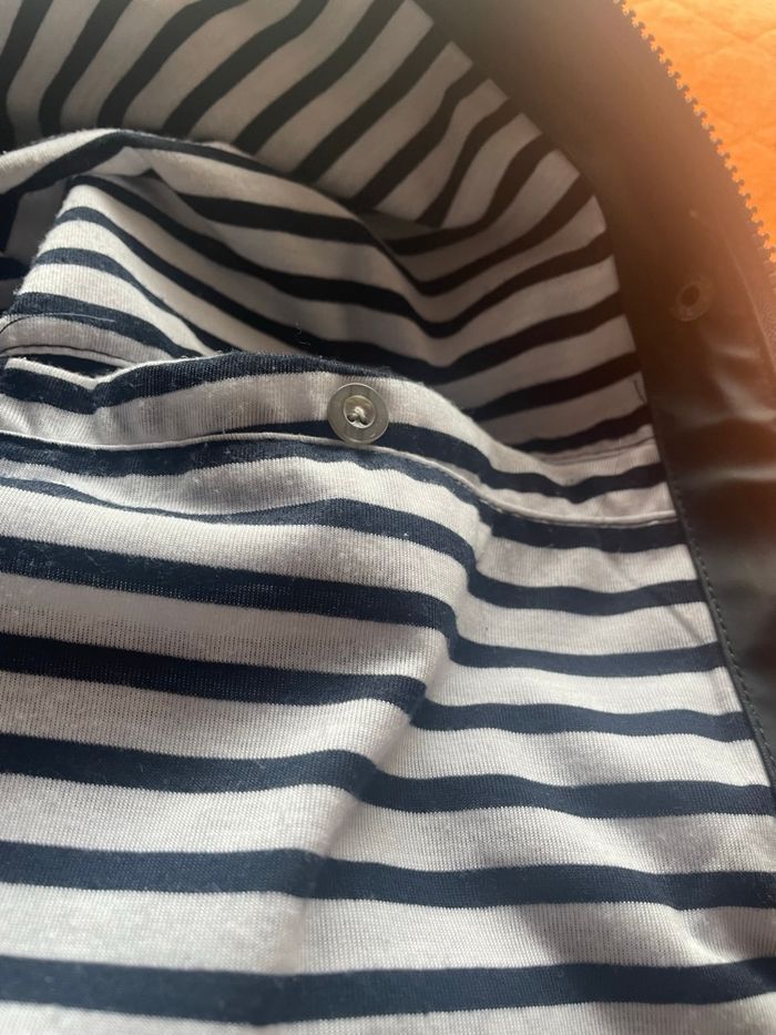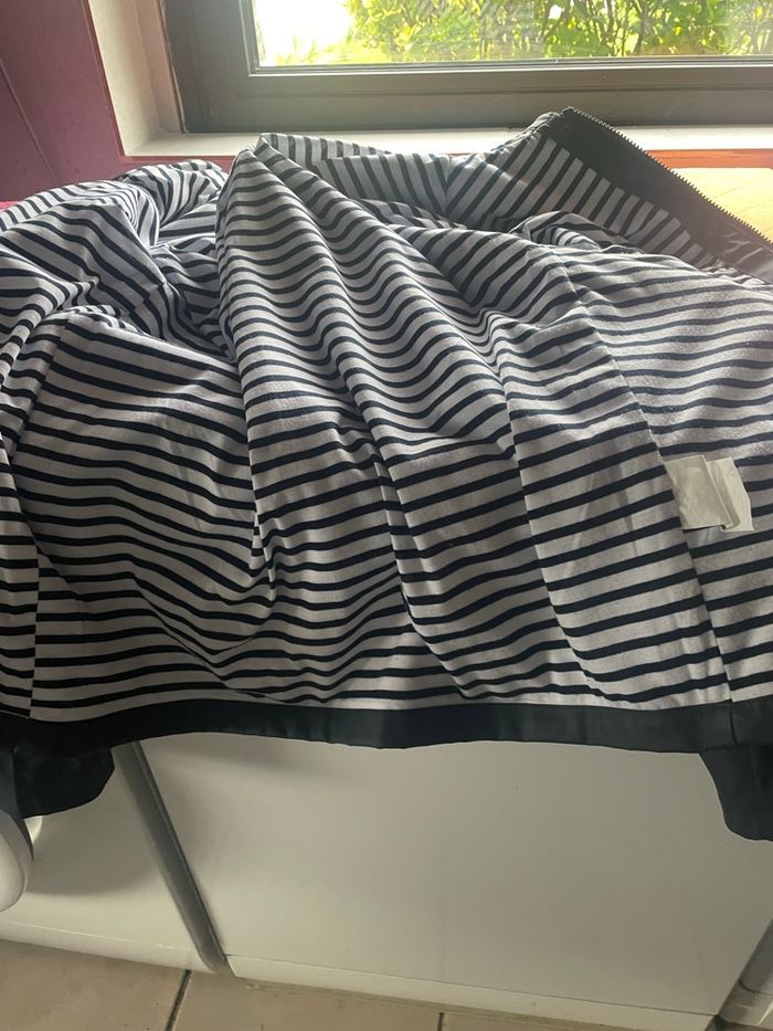 Vends blouson de pluie de couleur bleu marine intérieur rayé bleu et blanc Deux poches sur les côtés et une poche intérieur. Ferme avec fermeture et pression. Laver 1 fois à 30 degrés comme indiqué sur l’étiquette.