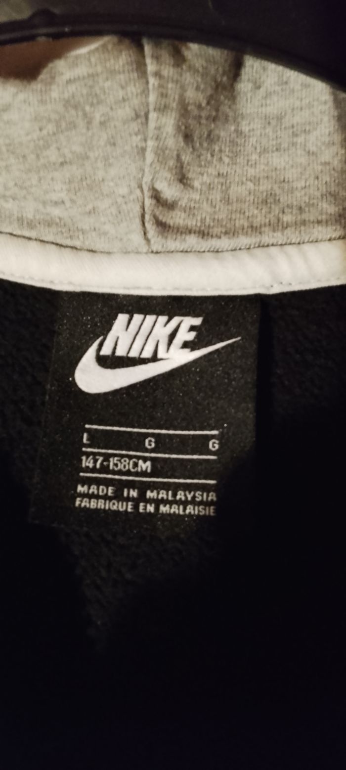 Sweat NIKE AIR noir à capuche doublée molleton gris. Grande poche latérale, col zippé, logo poitrine et manche. 12/14 ans