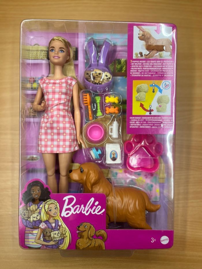 À vendre : Barbie Naissance des Chiots** **État : Neuf** **Description :** Coffret comprenant une poupée Barbie articulée, une chienne et ses 3 chiots. Ce set inclut de nombreux accessoires de soins pour les animaux. La poupée mesure 29 cm et convient aux enfants dès 3 ans. Référence : HCK75. **Ne ratez pas cette occasion de ravir un enfant avec cette adorable poupée et ses compagnons !** #Barbie #Neuf #Jouets #Chien #Poupée #NaissanceDesChiots