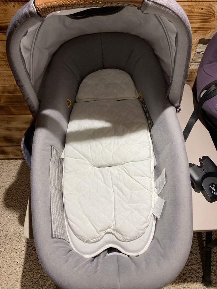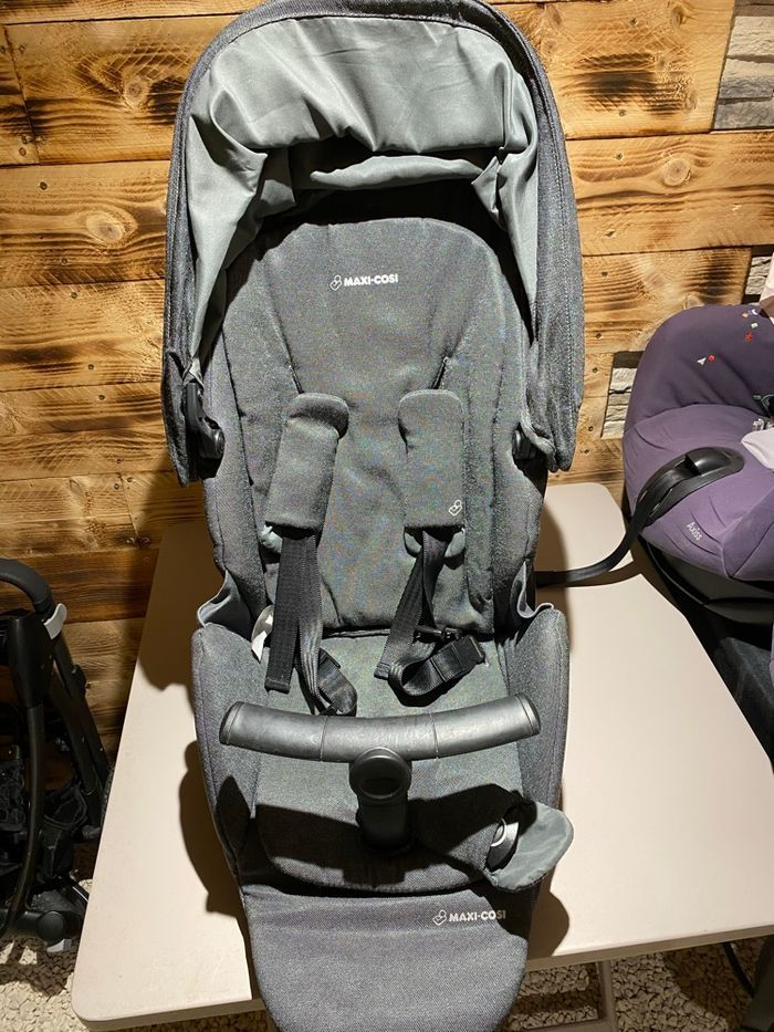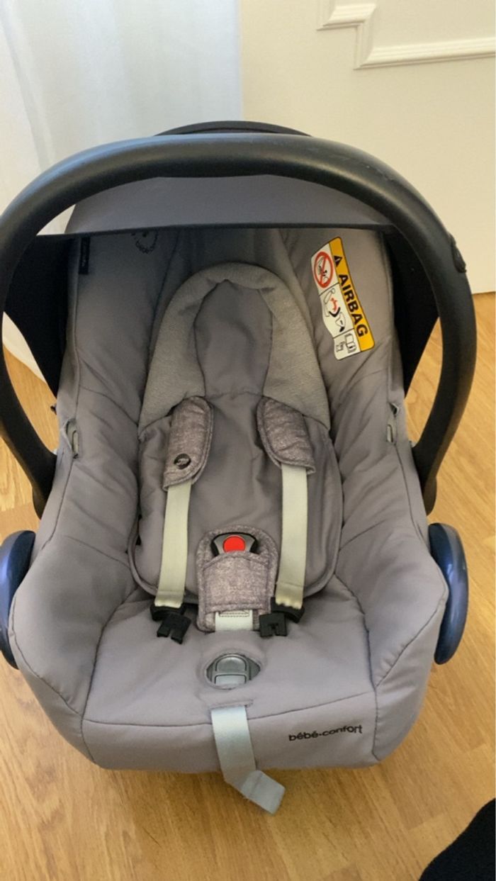 Bonjour, Je met en vente ma poussette trio de marque maxicosi pour l'armature et l'assise et de marque bebeconfort pour la nacelle et le cosy. Elle est en excellent état hormis le cosy. Nous avons malencontreusement fendus le polystyrène à l'intérieur du cosy ce qui ne garantie plus la sécurité en cas de choc. Cependant celui-ci est réparable auprès de la marque bebeconfort pour la somme de 90€. La nacelle et l'assise ont très peu été utilisées et donc en parfait état.