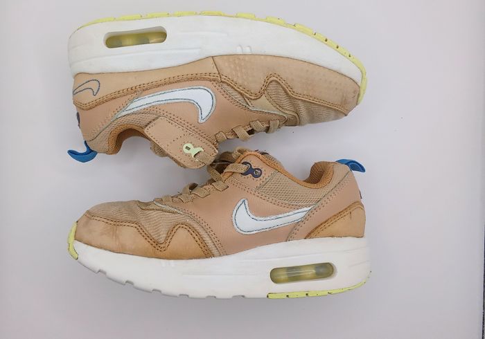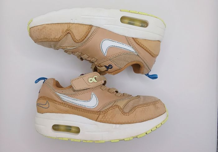 Nike Air Max 1 pour enfant, coloris beige avec swoosh blanc. Modèle confortable et iconique avec bulle d’air visible. ✔️ Taille : 30 ✔️ Bon état général – quelques légers défauts d’usage ✔️ Sans boîte d’origine ✔️ Envoi rapide sous 24h