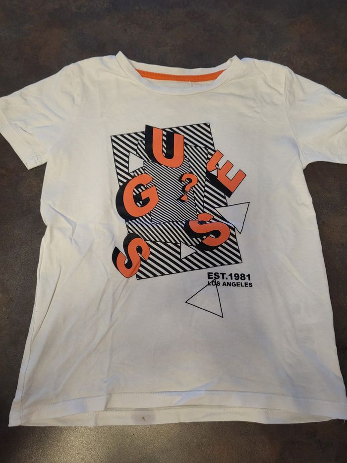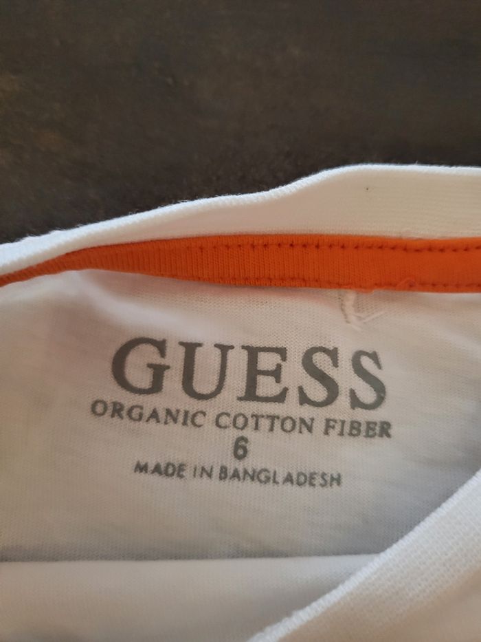 T-shirt Guess. Très bon état. 1 petit défaut sur la couture intérieure (photo 4) que je n'avais pas vu en l'achetant. T. 6 ans