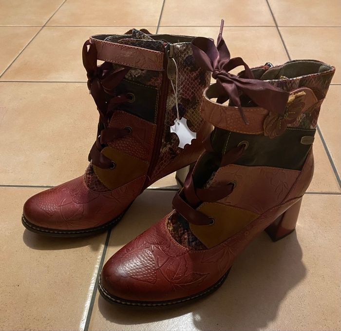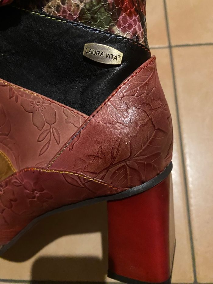 Bottines en taille 40 Marque : Laura Vita Modèle : IDCANO 04 Hauteur talon : 7,5 cm Non porté Petit défaut du cuir sur l’une d’elle (voir dernière photo)