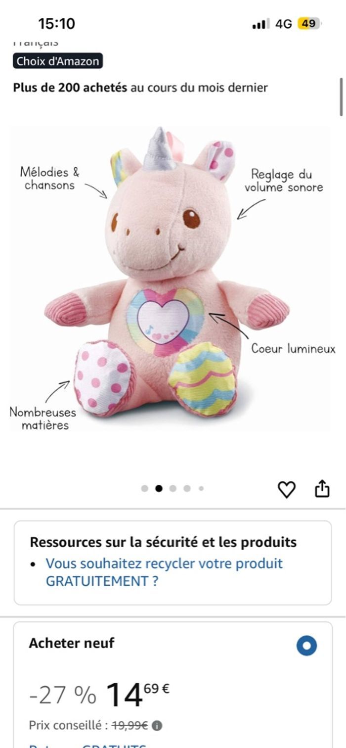 VTech - Maé, Ma Licorne à Câliner, Peluche Licorne Bébé Interactive et Apaisante, Jouet d'Éveil Musical et Sensoriel, Cadeau de Naissance Bébé - Contenu en Français Dès la naissance Attention Je n’ai plus la boîte