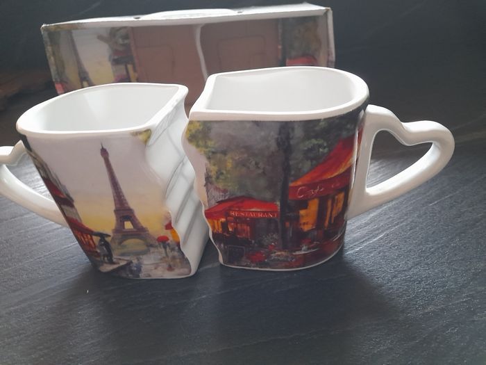 2 tasses : L'une la Tour Eiffel L'autre Café de Paris. Leurs anses en forme de cœur , dans leur carton d'origine