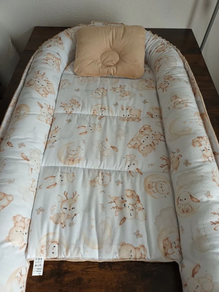 ⚠️ ARTICLE DÉJÀ VENDU ⚠️ Réducteur lit bébé réversible 0-6 mois 🌺🌟 Accompagné d'un petit coussin assorti et une petite couverture d'appoint 50/60cm environ Tissus coton motifs animaux et micropeluche Couleur beige clair 🌸🌸🌸 🫶 Ensemble 3 pièces 50€ 🫶 Lavage à 30'degrés ⚠️ A ne pas utiliser de sèche linge ⚠️ Repassage doux uniquement sur le tissus motifs Envois rapide et soigné 😊