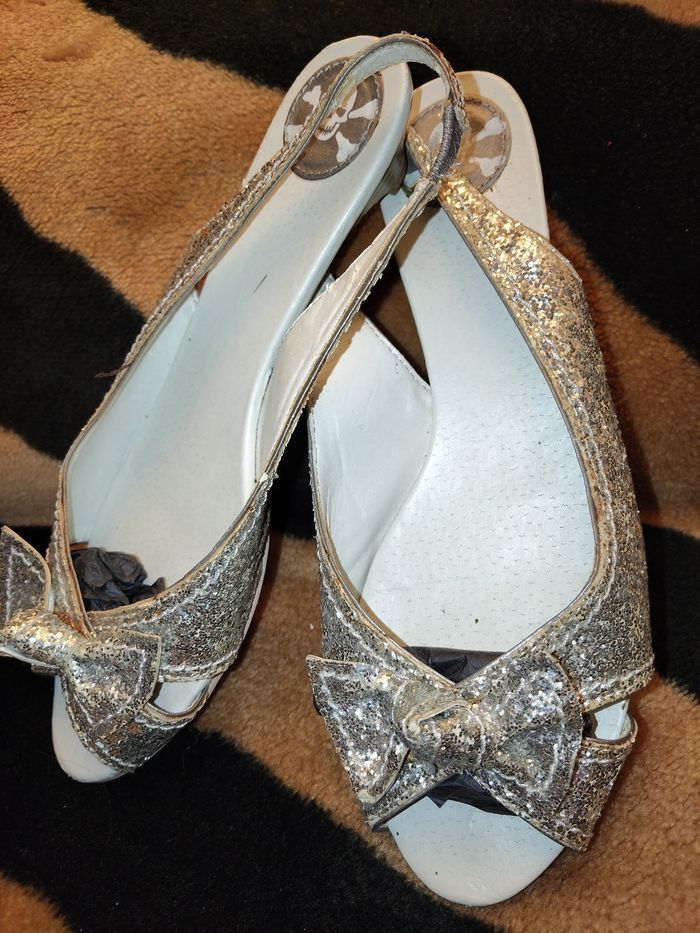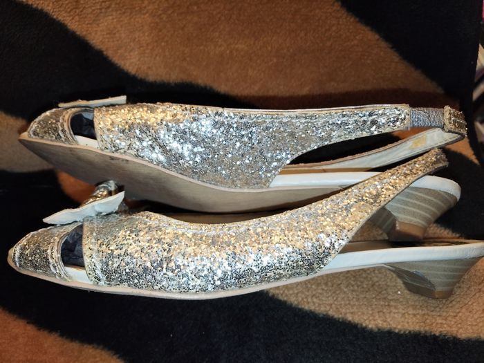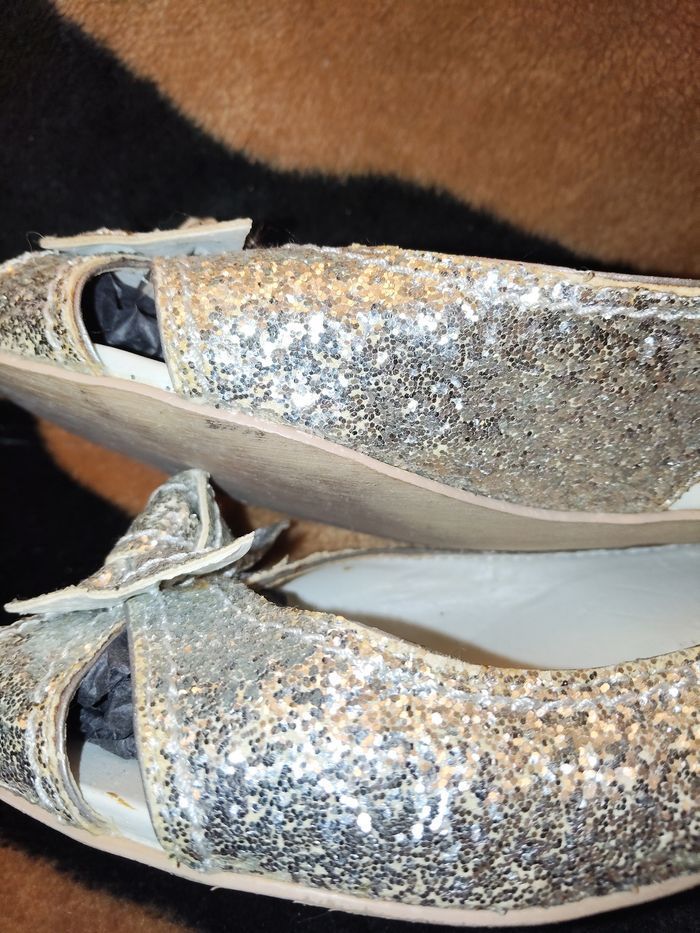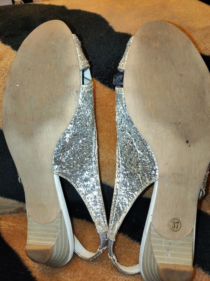 Chaussures paillettes Argenté Joli modèle Pointure 36 Petit talon bois Chaussures ouvertes, soirée, argenté, paillettes, pointure 36
