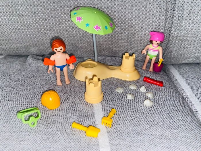 Playmobil plage Château de sable Râteau pelle Coquillage Masque de plongée Crème solaire Parasol 2 enfants