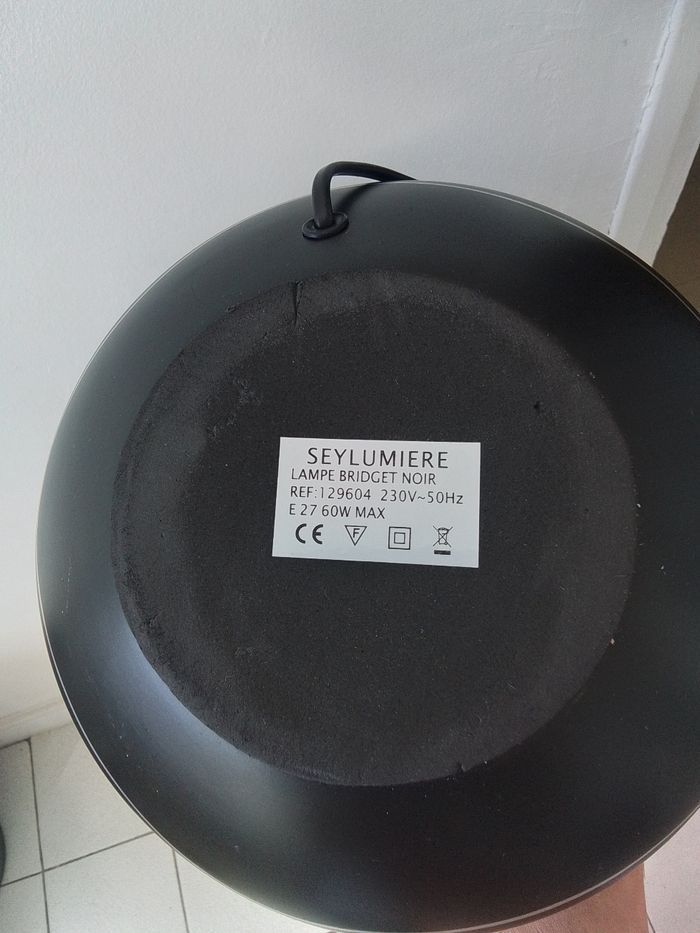 Lampe à poser avec interrupteur sur le câble. Bridget noir et argenté. Marque Seylumiere. Hauteur 41cm Diamètre abat-jour 21cm Propre en très bon état général. Petit défaut à l’intérieur de l’abat-jour. Non visible à l’extérieur.
