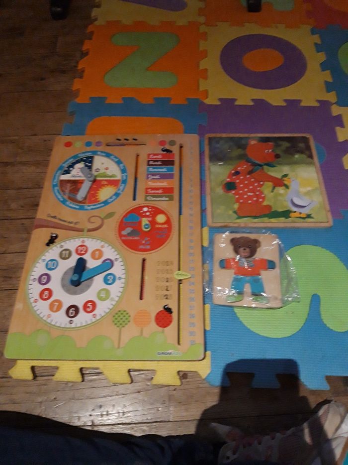 Lot jouets : - deux petits puzzles bon etat - calendrier perpetuel manque 2 fleches 1 euro le tout (Caisse MARJO)