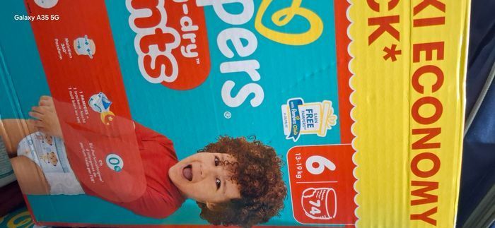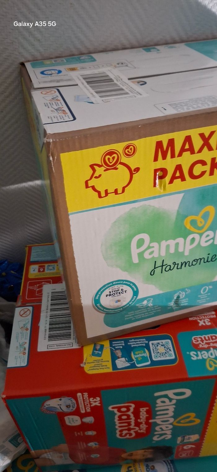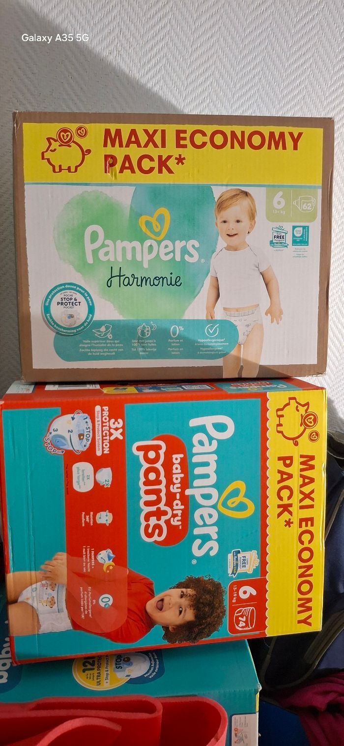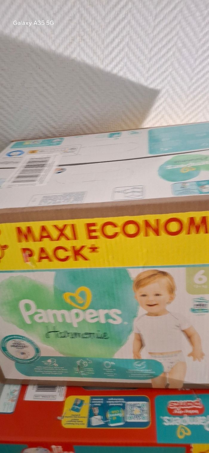 Je vends ce lot de deux cartons de couches Pampers taille 6 de la marque Pampers.