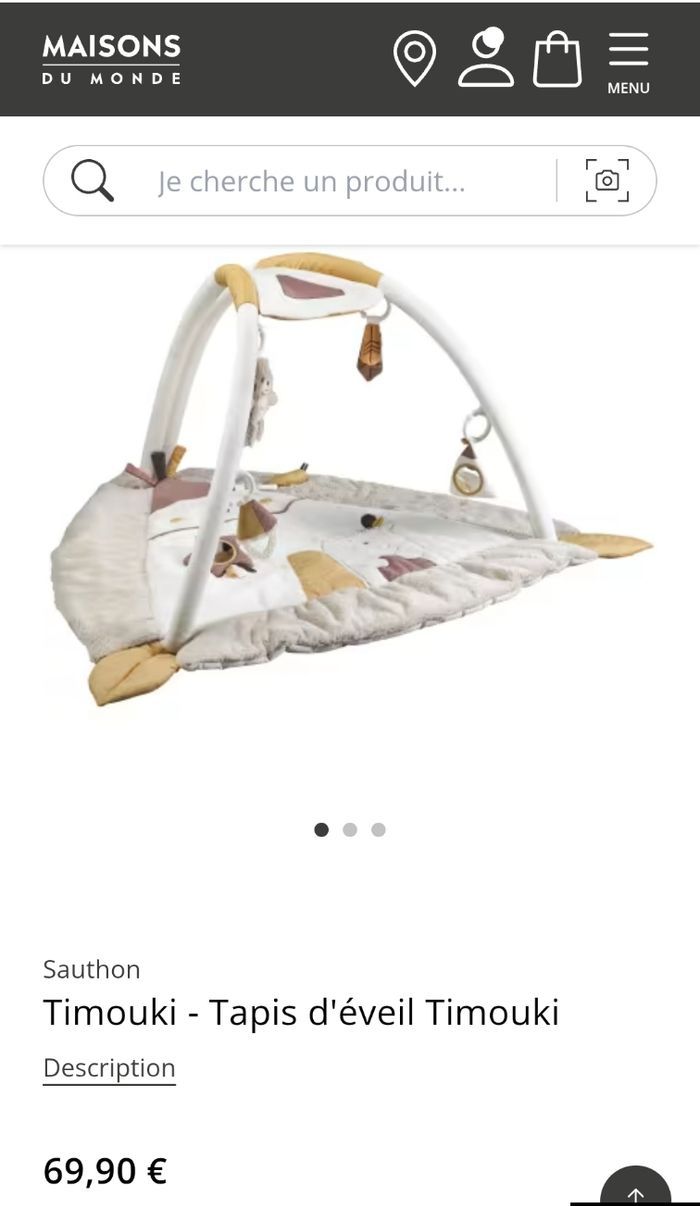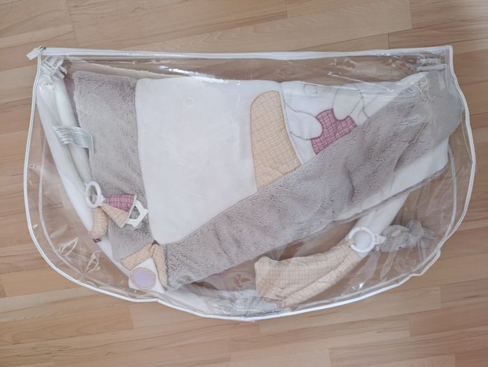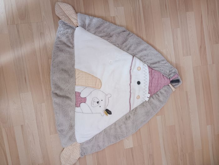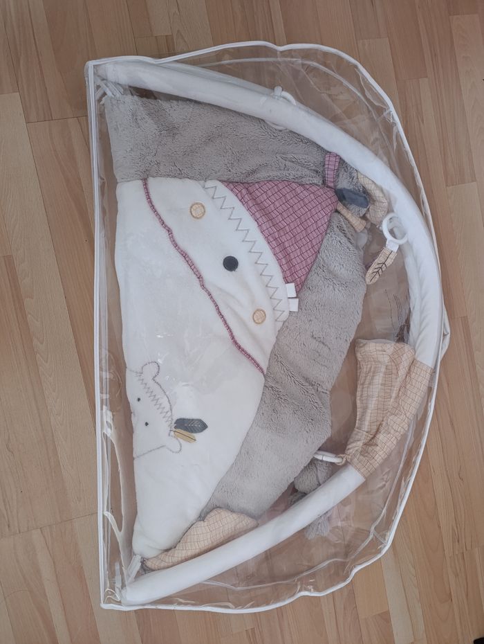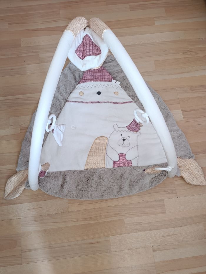 Tapis d'éveil avec arches amovibles Sans tâches, très bon état. Les attaches de l'arche comme neuves pour attacher ou détacher en fonction des envies de bébé. Vendu avec son sac de rangement d'origine.