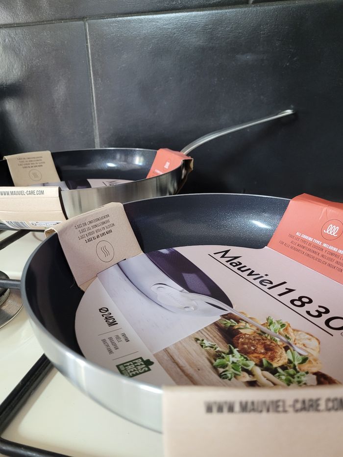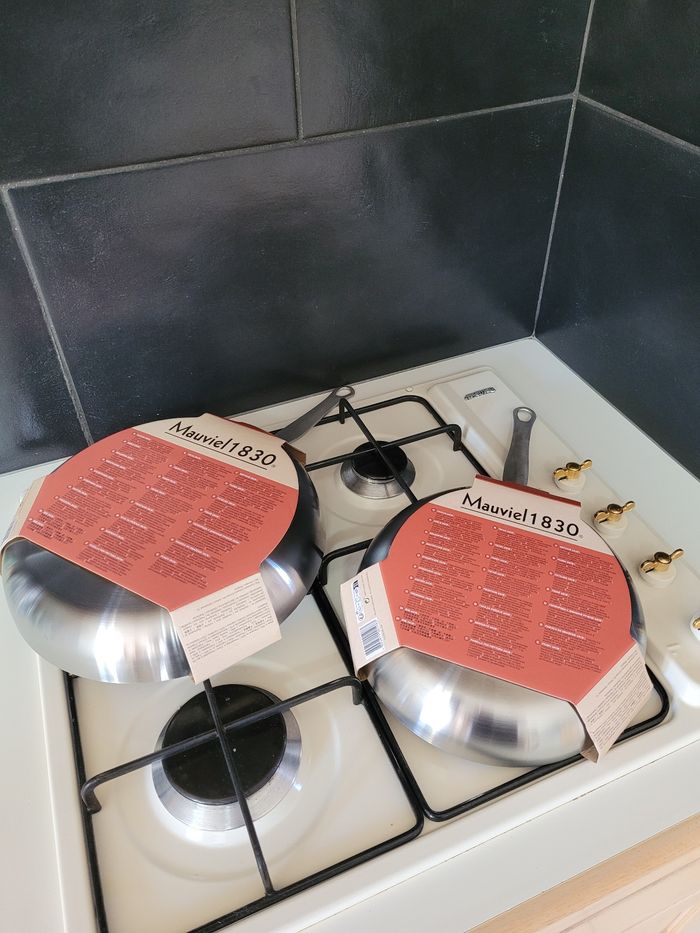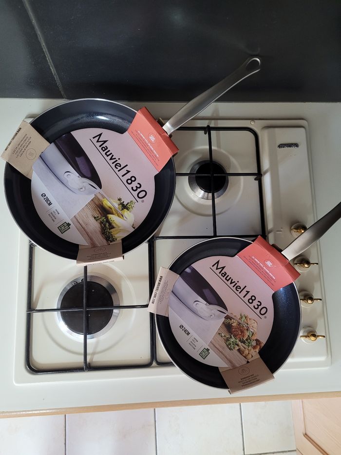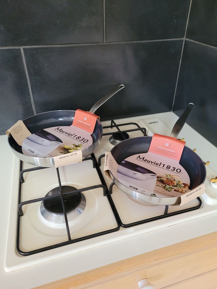 Vente d'un lot de deux poêles de la marque Mauviel 1830, de diamètre 24 et 28 cm. Elles sont adaptées à toutes sources de chaleur y compris l'induction, compatibles lave-vaisselle. Revêtement antiadhésif qui empêche les aliments de coller. Peut-être utiliser au four, jusqu'à une température de 220°C. Gamme Classic Tri-Ply. Vente à l'unité possible. Envoie soigné. Si vous avez des questions, veuillez me contacter. #poeles #mauviel #cuisine