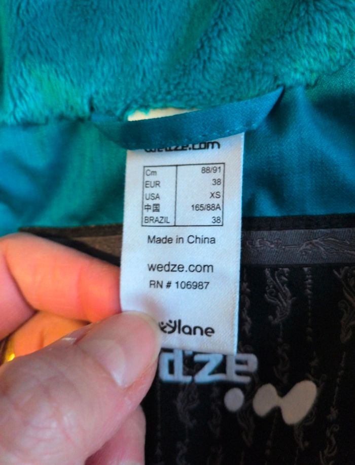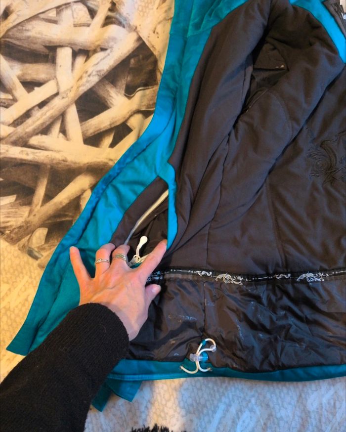 Manteau de ski en très bon état. Juste le capuchon au bout d'un des liens de serrage de la capuche qui a été cassé. Bleu canard. Taille 38, 88/91cm. Dimensions en photos