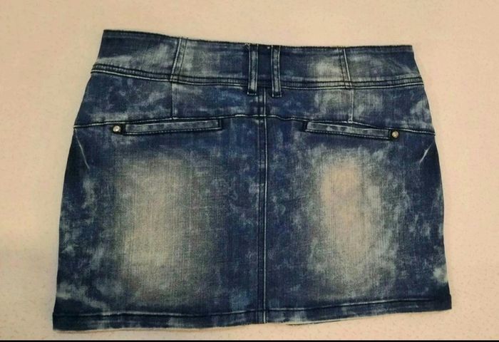 Mini jupe en jean délavé, zippée de haut en bas. Poches zippées à l'avant et strass aux poches arrières. En parfait état. Marque : Magic Street (LA Redoute)