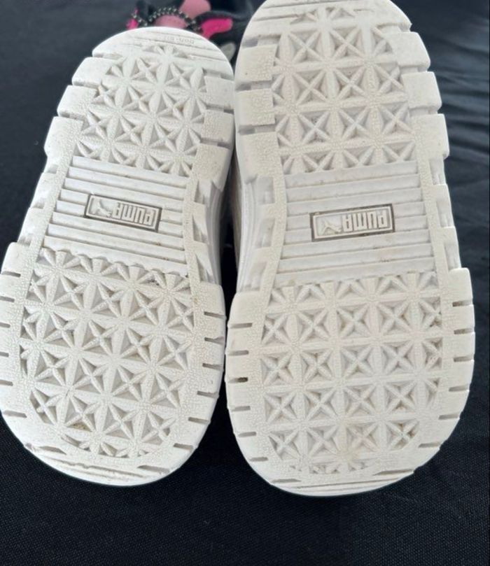 Je vends ces baskets Puma pour bébé, taille 22. - Type de produit : Baskets - Marque : Puma - Taille : 22 - Couleur : Blanc - Caractéristiques : Lacets, détails en métal en forme de cœur N'hésitez pas à me contacter pour plus d'informations.
