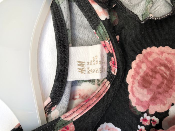 Robe mi-saison H&M, Taille 9 mois/ 74 cm, Manches longues, En coton (matière t-shirt). Très jolie robe gris très foncé, avec des motifs de roses, roses et blanches. Volants sur l’avant et les épaules. Ouverture par pressions sur l’épaule gauche. En très bon état : sans trou ni tache. 🌸 Vous aimez cet article ? N’oubliez pas de visiter le reste de mon dressing en filtrant les tailles.