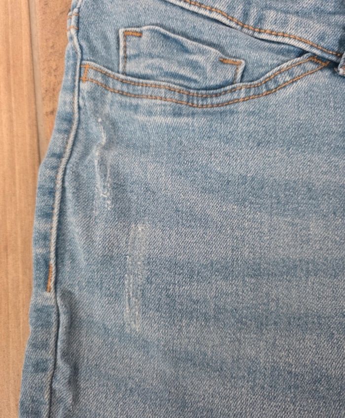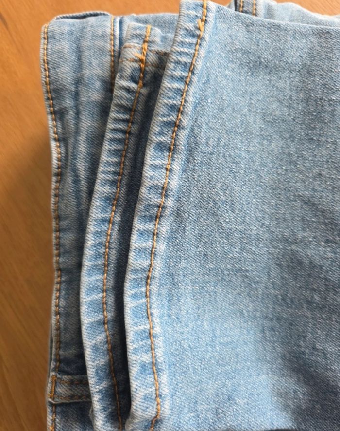 Porté durant la grossesse mais en excellent état Pas de bouloches, pas de traces d'usure (ex entrejambe ou bas de jambe) sauf celles faites/voulues par la fabrication! Partie ventrale non distendu Coupe mom tres agréable Jean epais très légèrement stretch Bouton fantaisie devant 2 fausses poches avant et 2 poches arrière Passant ceinture Surpiqures contractées en fil jaune Deux systèmes élastiques permettant d'ajuster la taille au niveau du bas ventre Taille 44 La couleur est celle de la premiere photo bleu clair "delavée" Valeur neuve 25€ en magasin