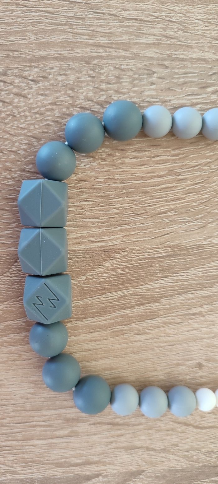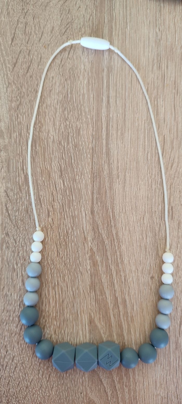 Je vends un collier d'allaitement gris et blanc , en matière silicone. Marque minty wendy En parfait état.