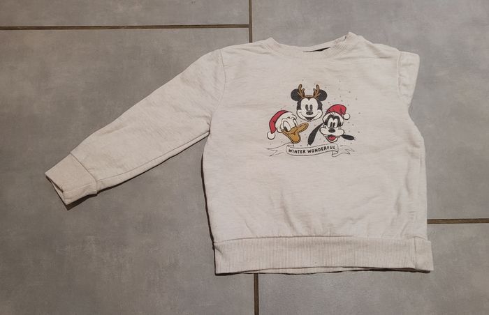 Sweat de couleur beige avec motifs, idéal pour Noël, de la marque Disney, taille 24 mois, en très bon état. Article lavé pour la vente.