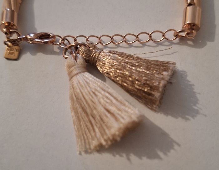 Bracelet rose gold avec des lanières et des petites perles. Il y a deux pompons de couleur différente pour une jolie finition. La chaîne est ajustable à votre poignet.